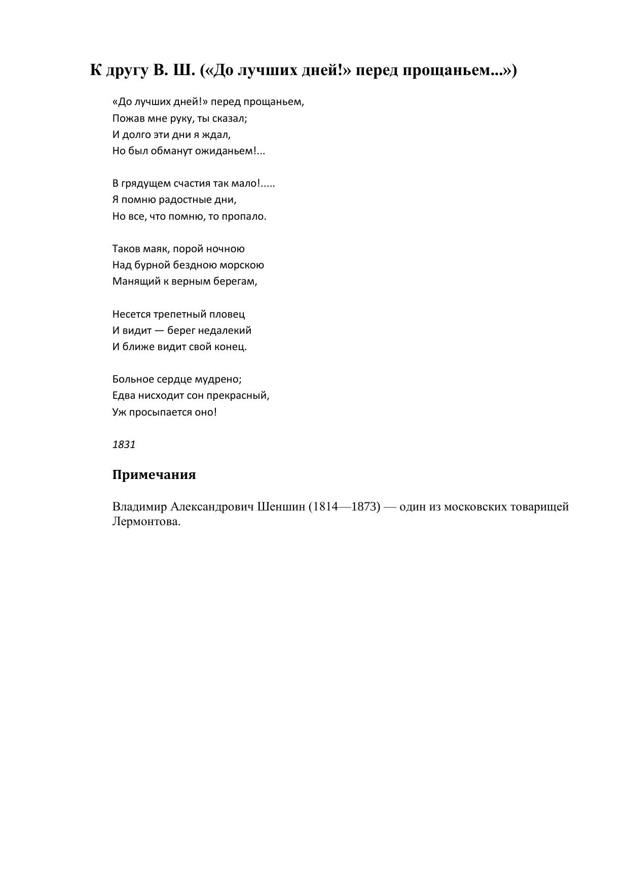 К другу В. Ш. (До лучших дней! перед прощаньем...)