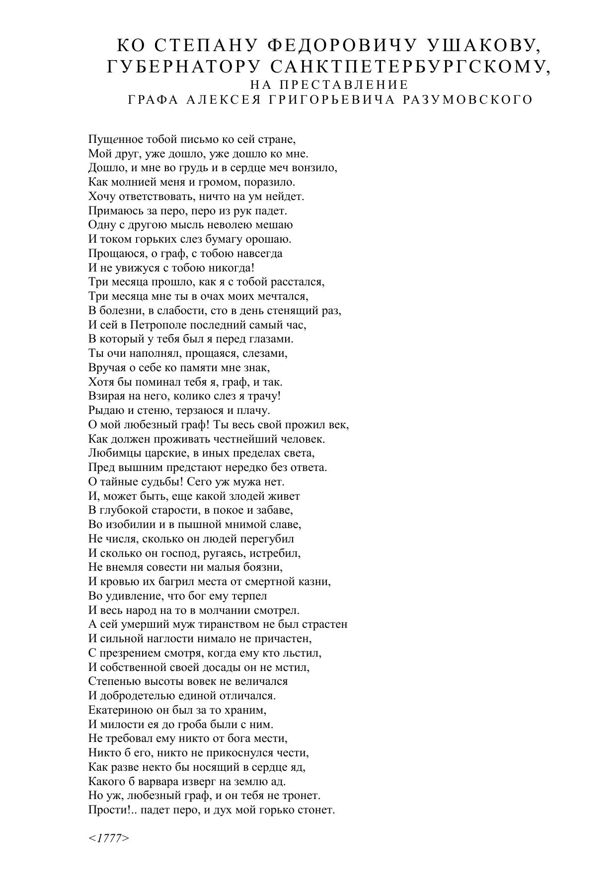 Ко Степану Федоровичу Ушакову, губернатору санкт-петербургскому, на преставление графа Алексея Григорьевича Разумовского