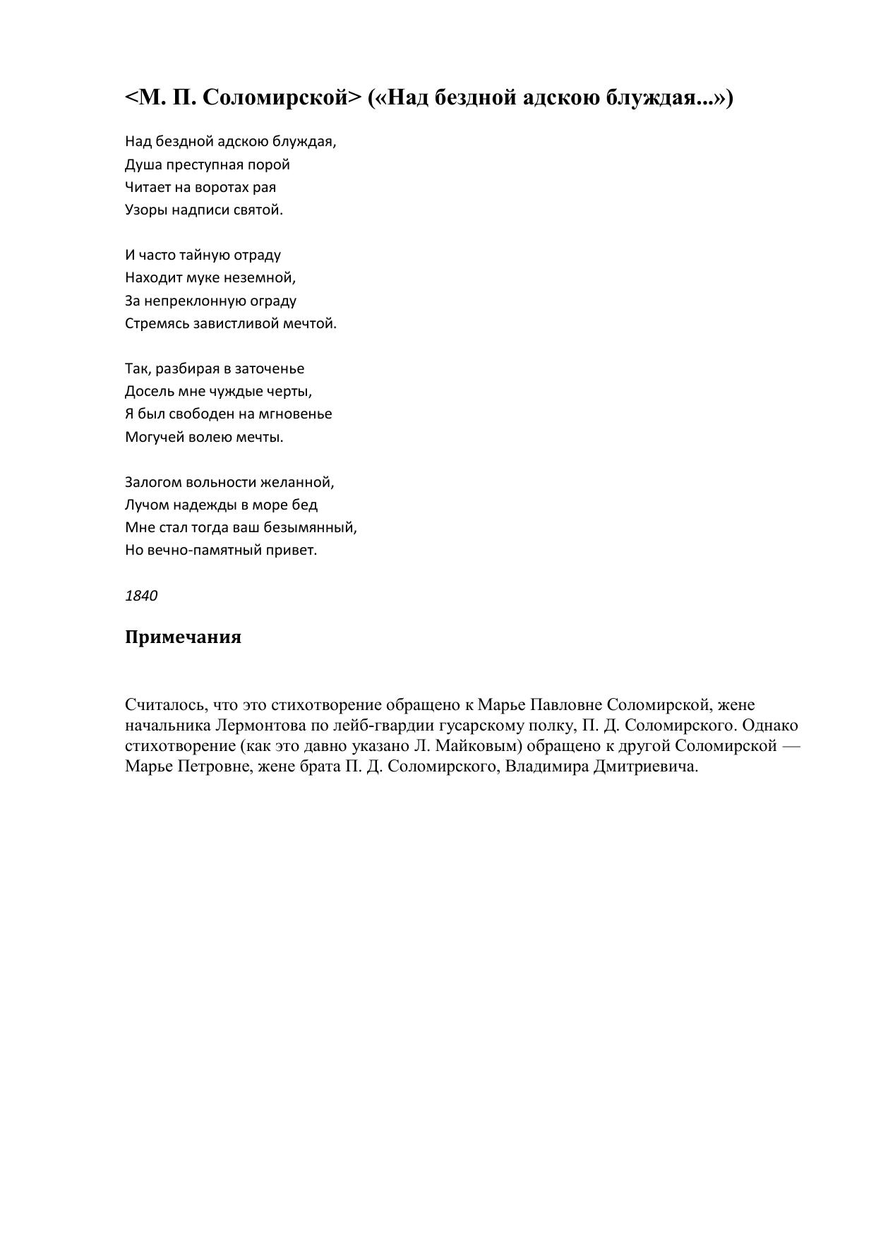М. П. Соломирской (Над бездной адскою блуждая...)