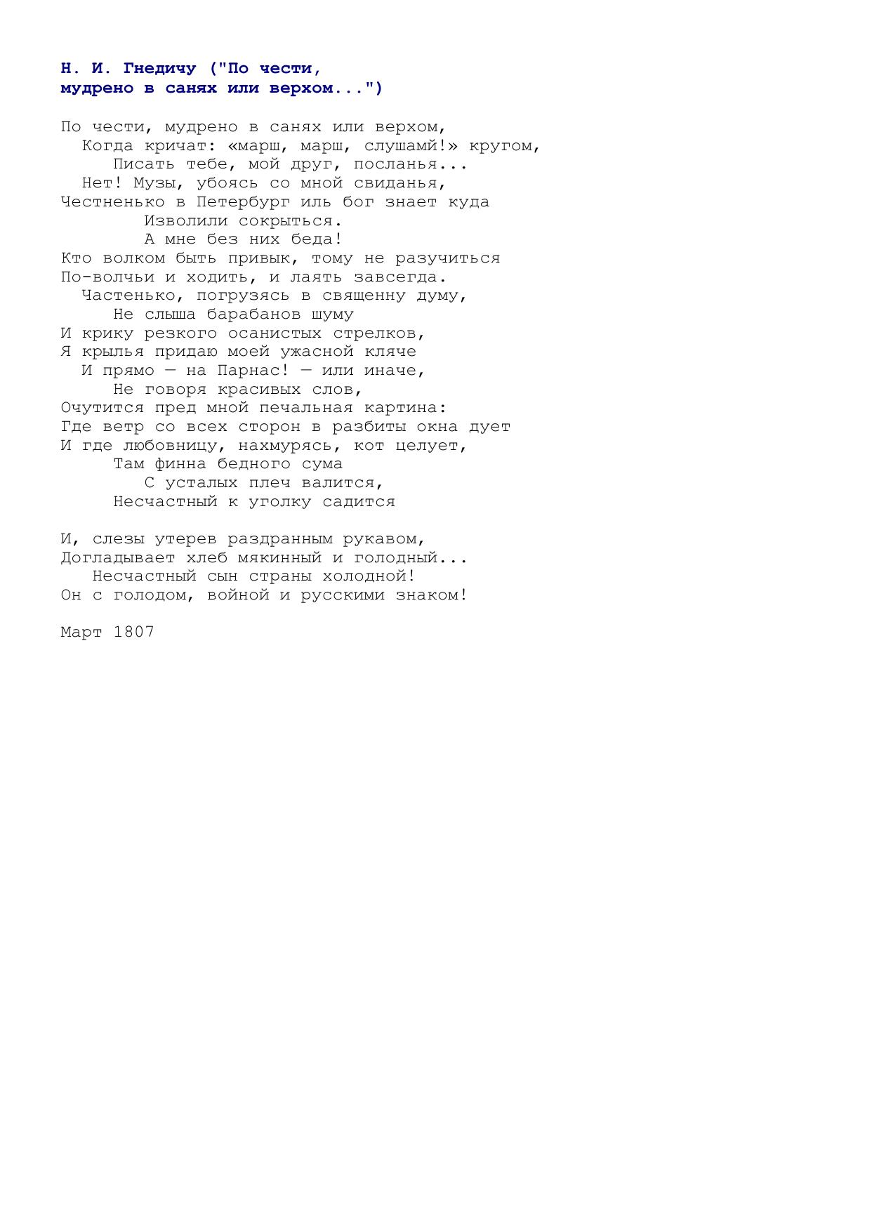 Н. И. Гнедичу (По чести, мудрено в санях или верхом...)