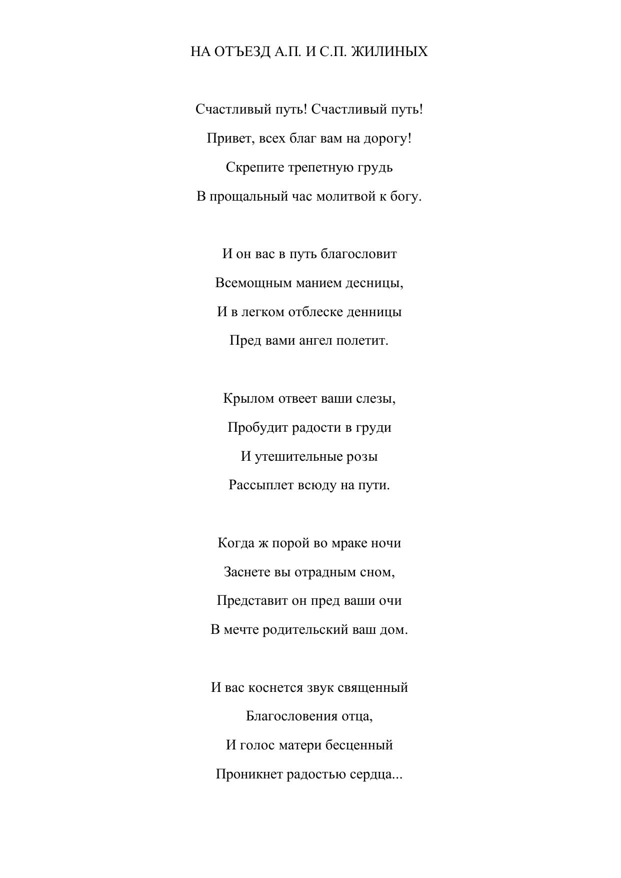 На отъезд А. П. и С. П. Ж<илиных>