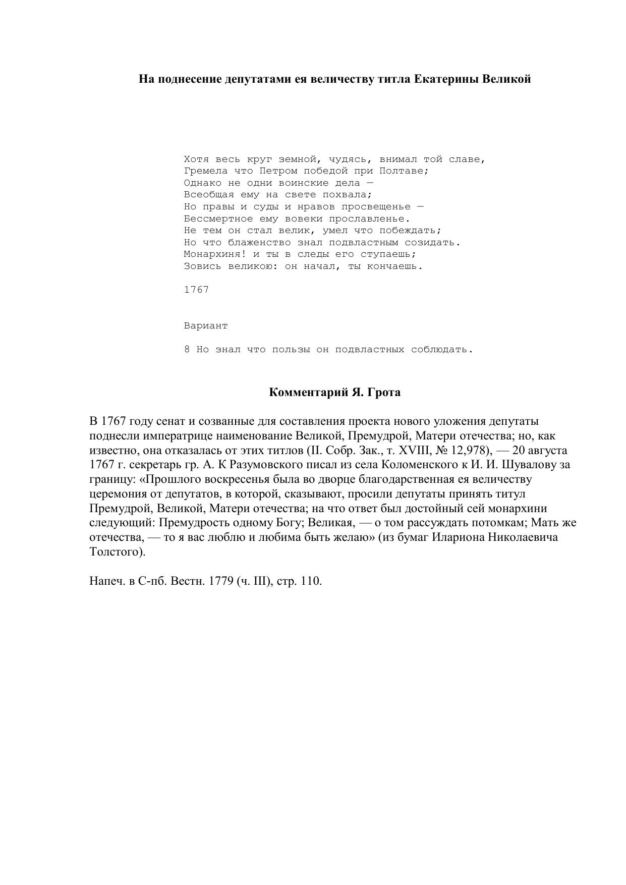 На поднесение депутатами ея величеству титла Екатерины Великой