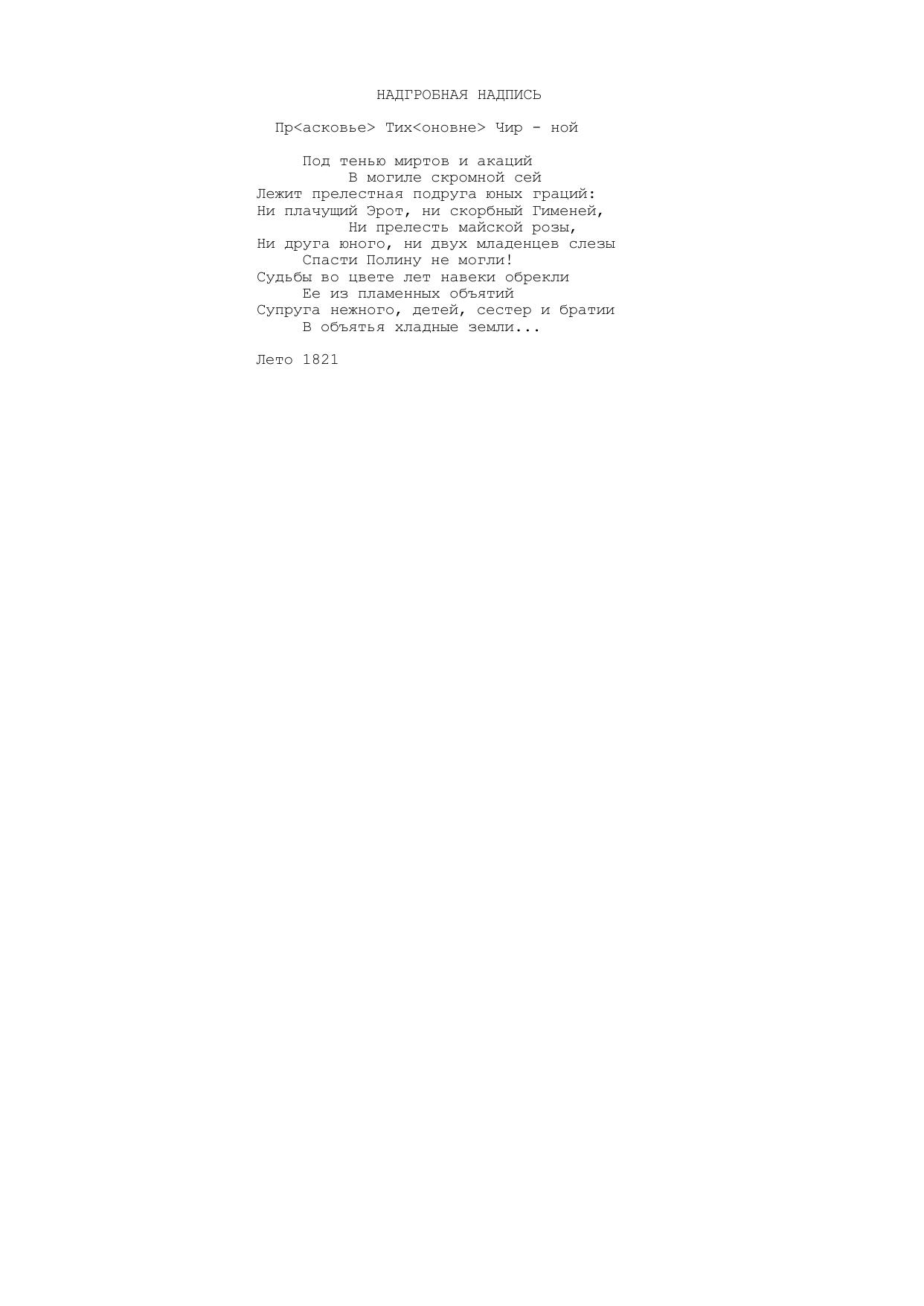 Надгробная надпись. Прасковье Тихоновне Чир - ной