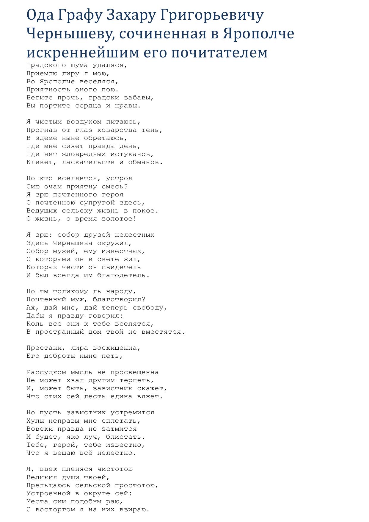 Ода Графу Захару Григорьевичу Чернышеву, сочиненная в Ярополче искреннейшим его почитателем