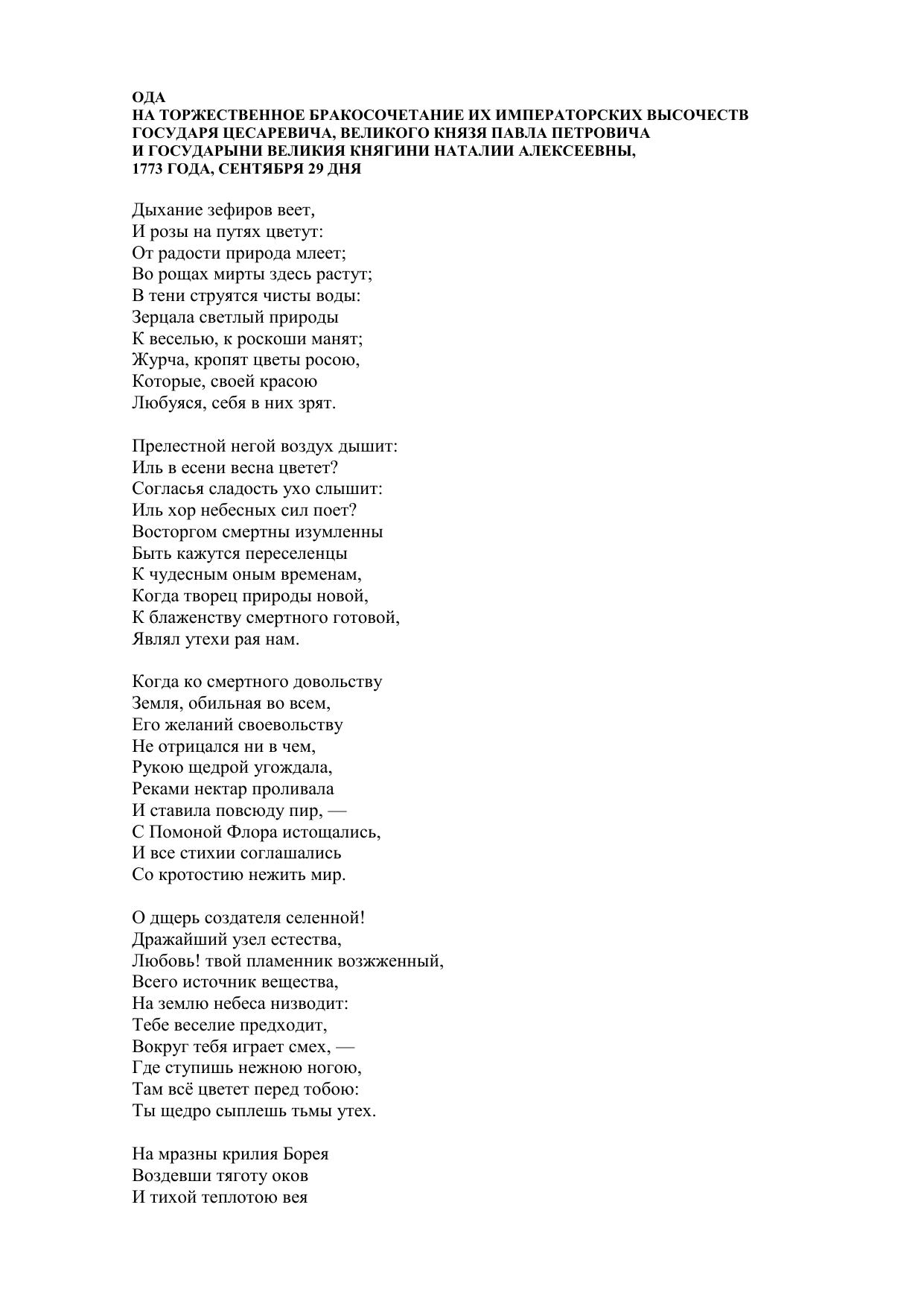 Ода на торжественное бракосочетание их императорских высочеств государя цесаревича, великого князя Павла Петровича и государыни великия княгини Наталии Алексеевны, 1773 года, сентября 29 дня
