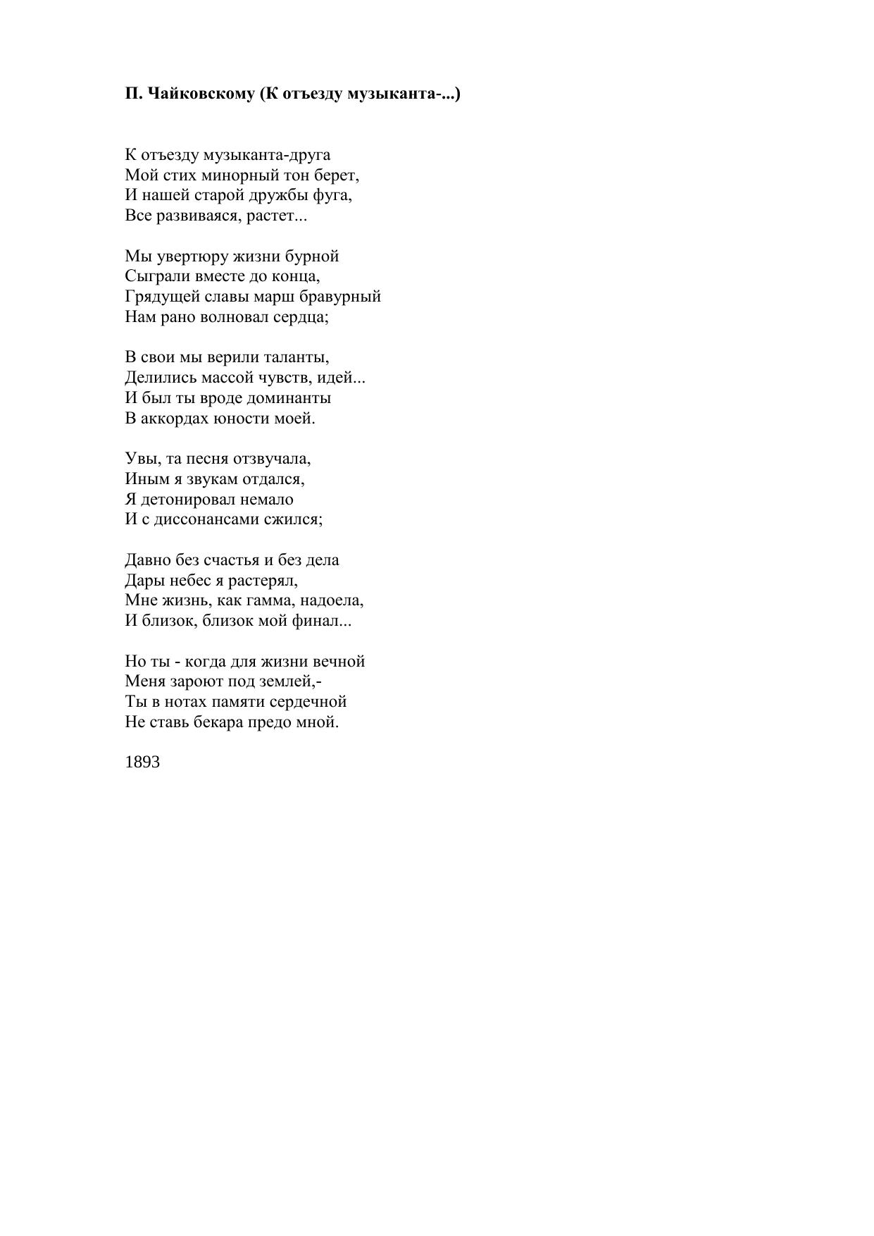 П. Чайковскому (К отъезду музыканта...)