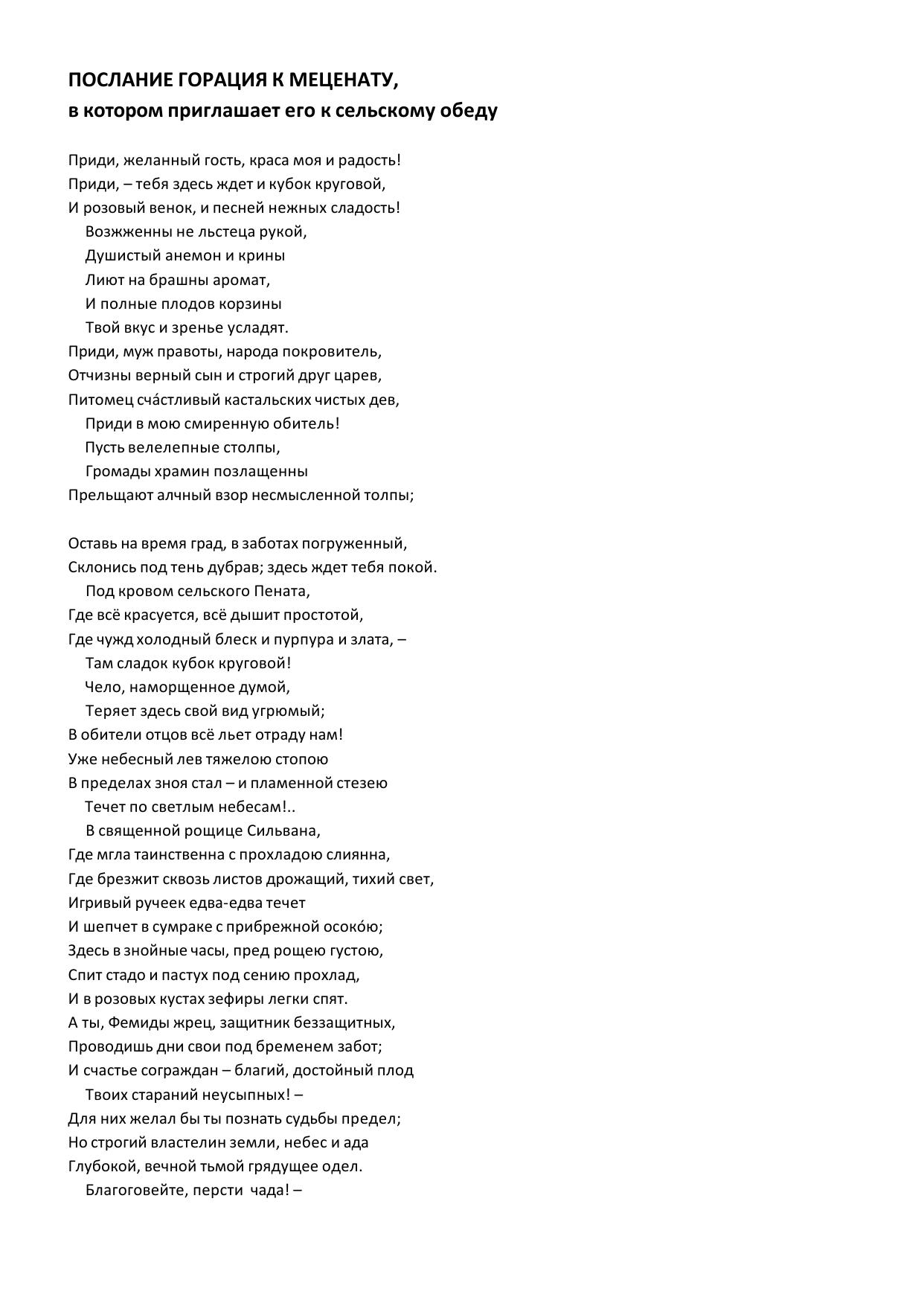 Послание Горация к меценату, в котором приглашает его к сельскому обеду