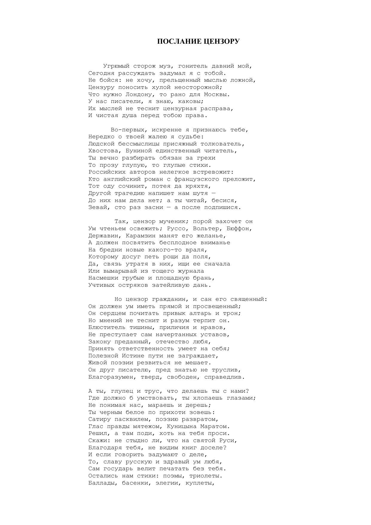 Послание цензору ("Угрюмый сторож муз, гонитель давний мой...")