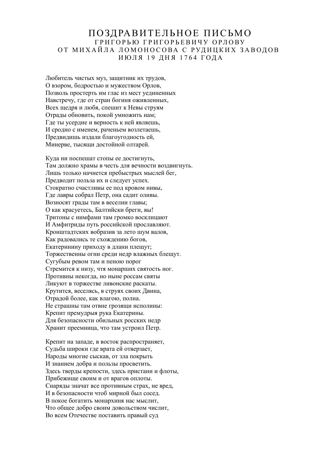 Поздравительное письмо Григорью Григорьевичу Орлову июля 19 дня 1764 года