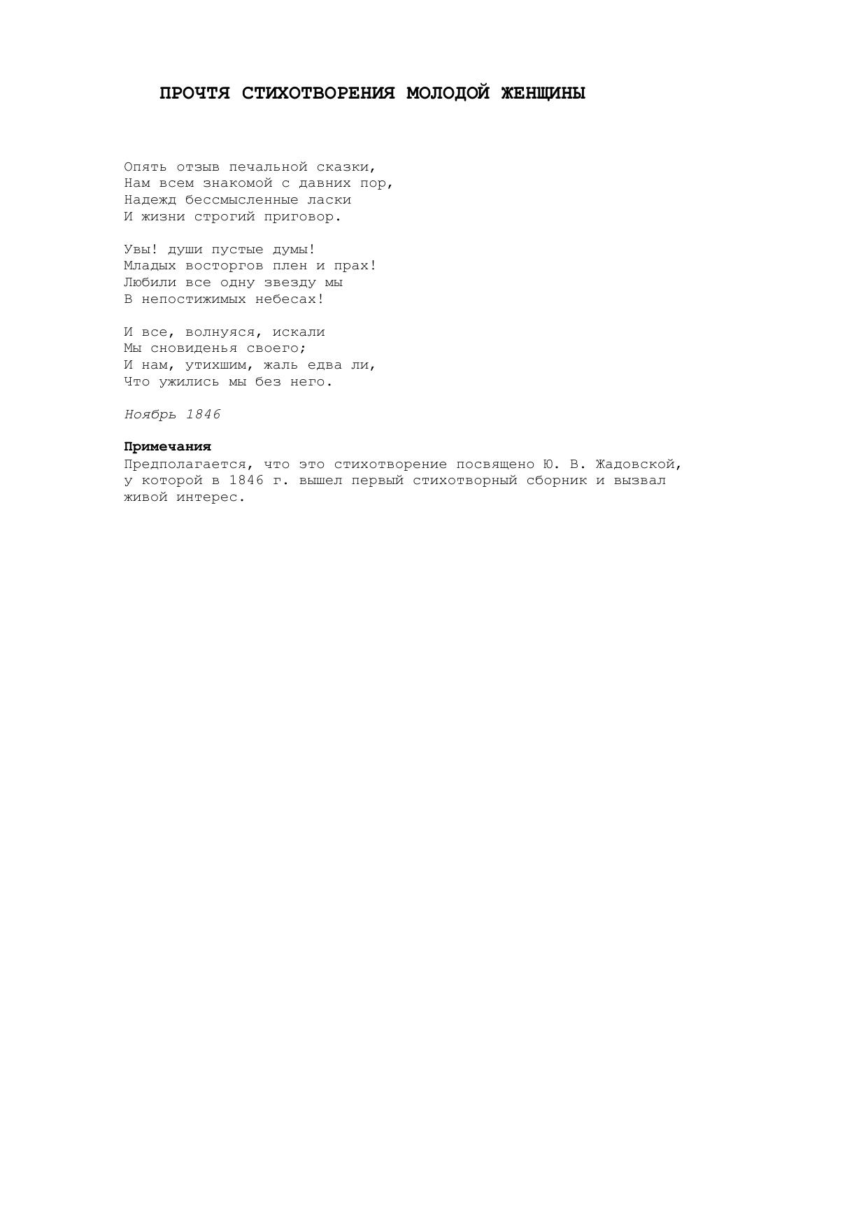 Прочтя стихотворения молодой женщины (Опять отзыв печальной сказки...)