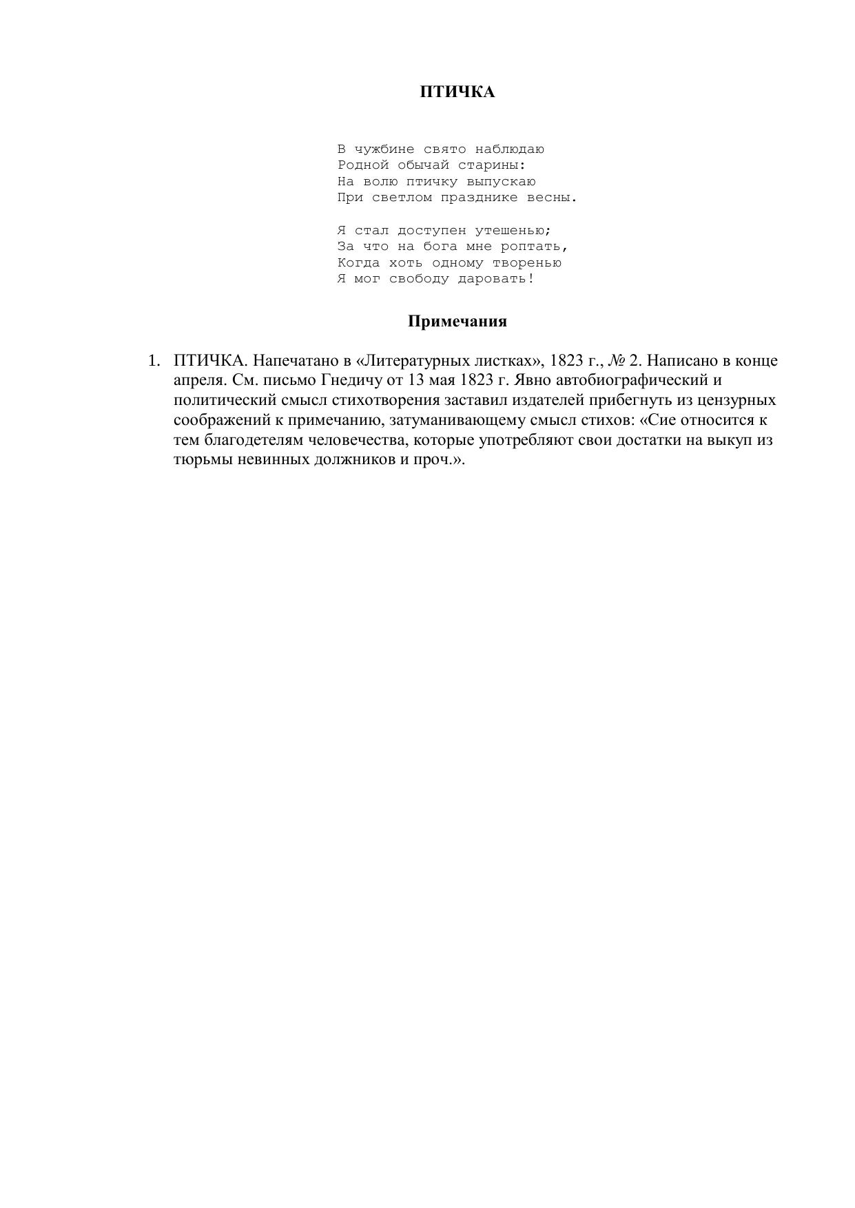 Птичка ("В чужбине свято наблюдаю...")