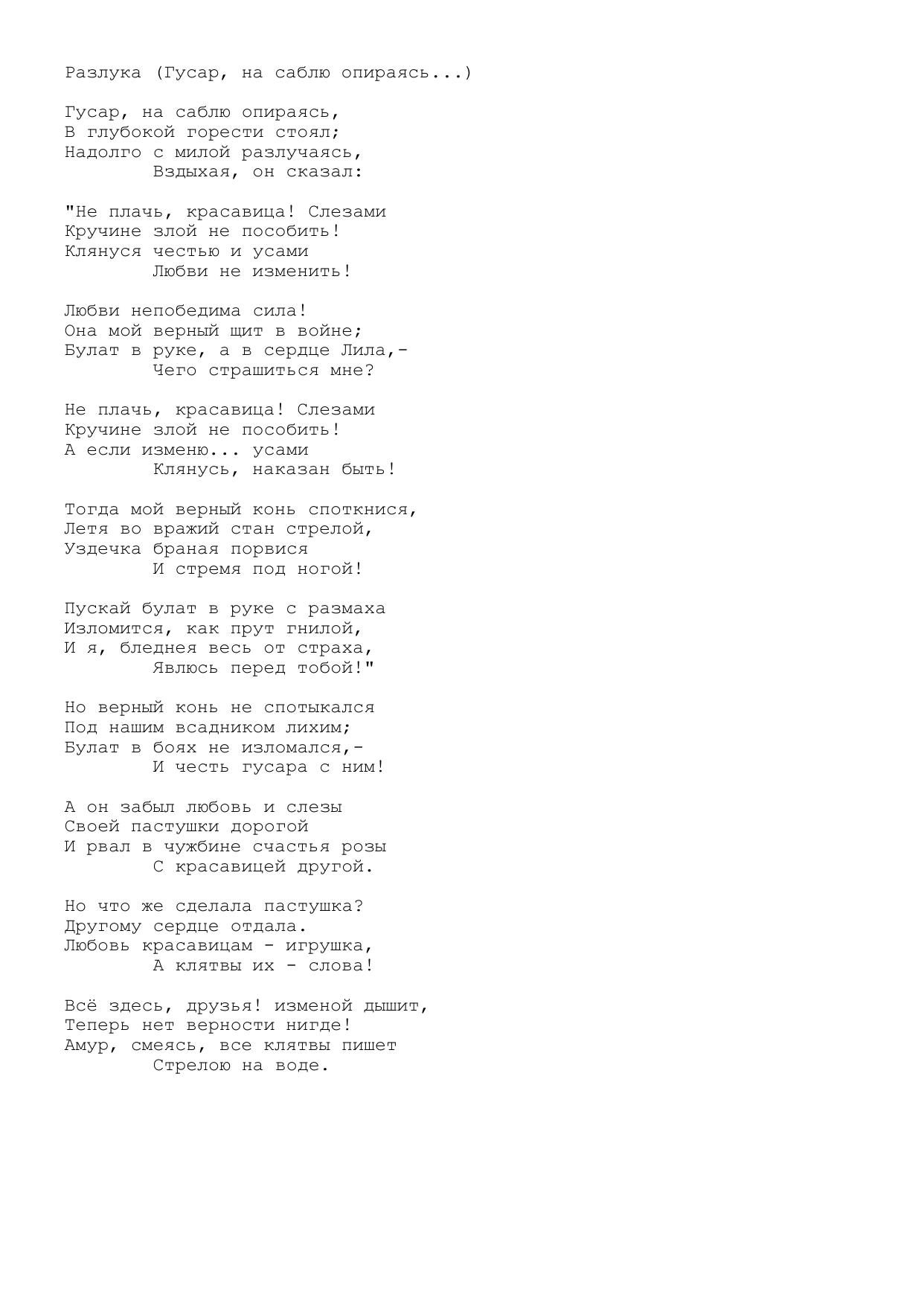 Разлука (Гусар, на саблю опираясь...)