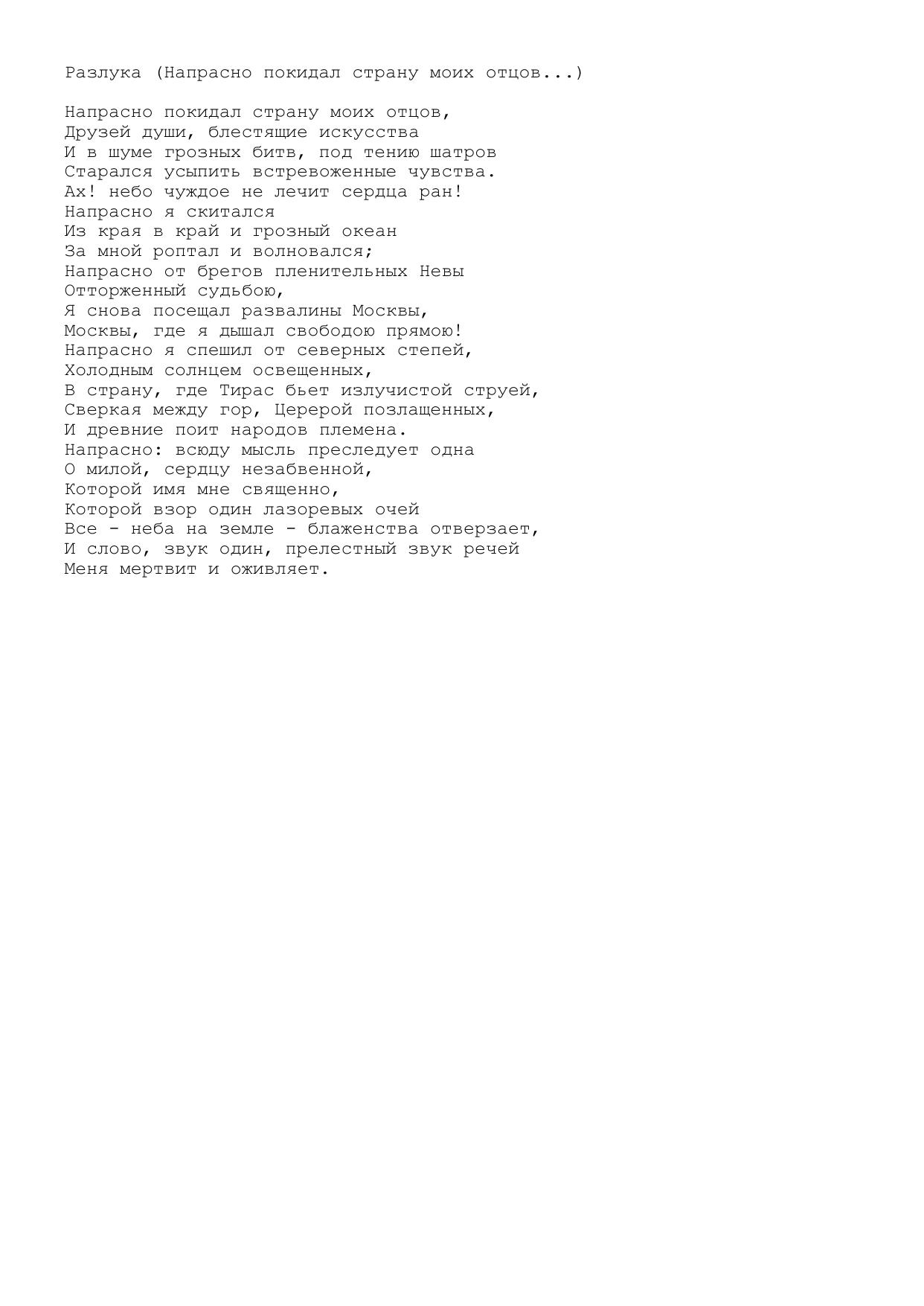 Разлука (Напрасно покидал страну моих отцов...)