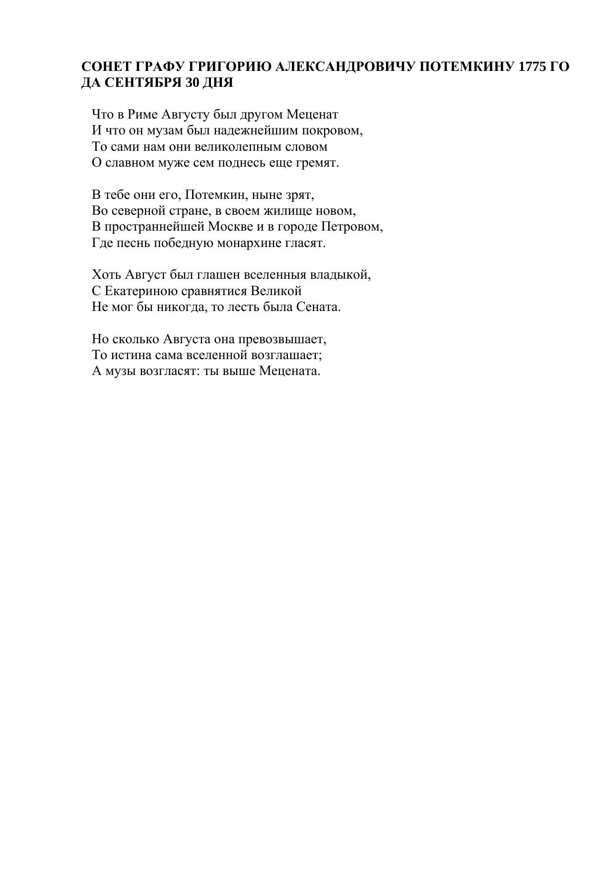 Сонет Графу Григорию Александровичу Потемкину 1775 года сентября 30 дня