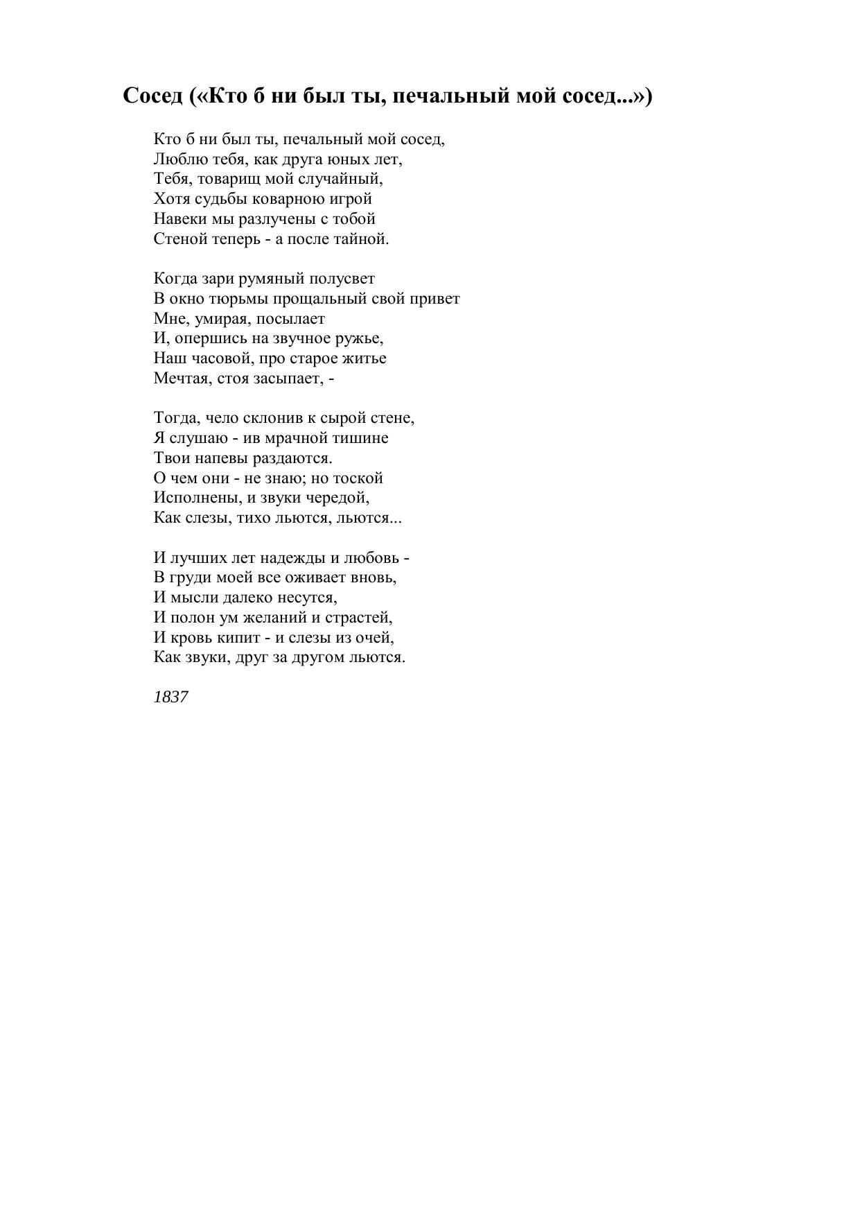 Сосед (Кто б ни был ты, печальный мой сосед...)