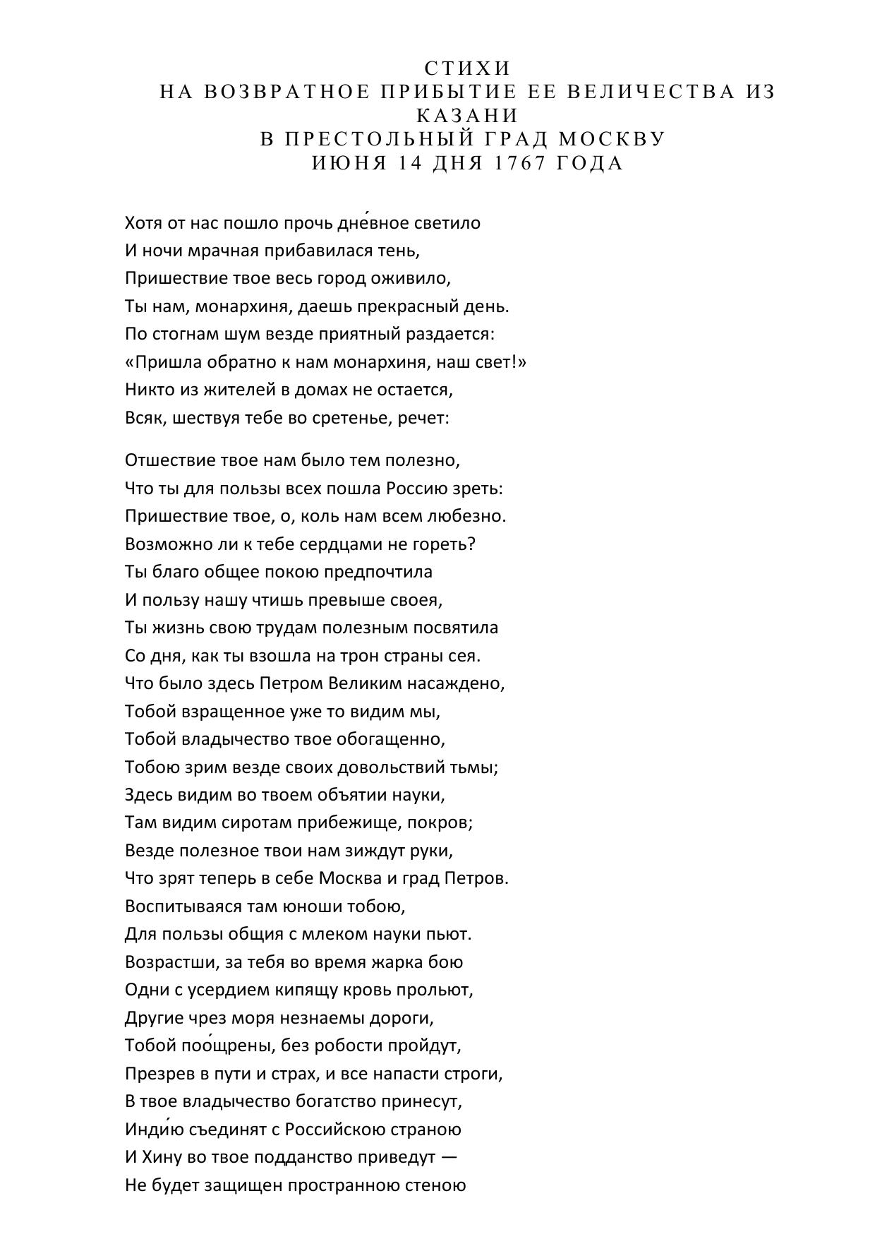 Стихи нa возвратное прибытие Её Величества из Казани в престольный град Москву июня 14 дня 1767 года