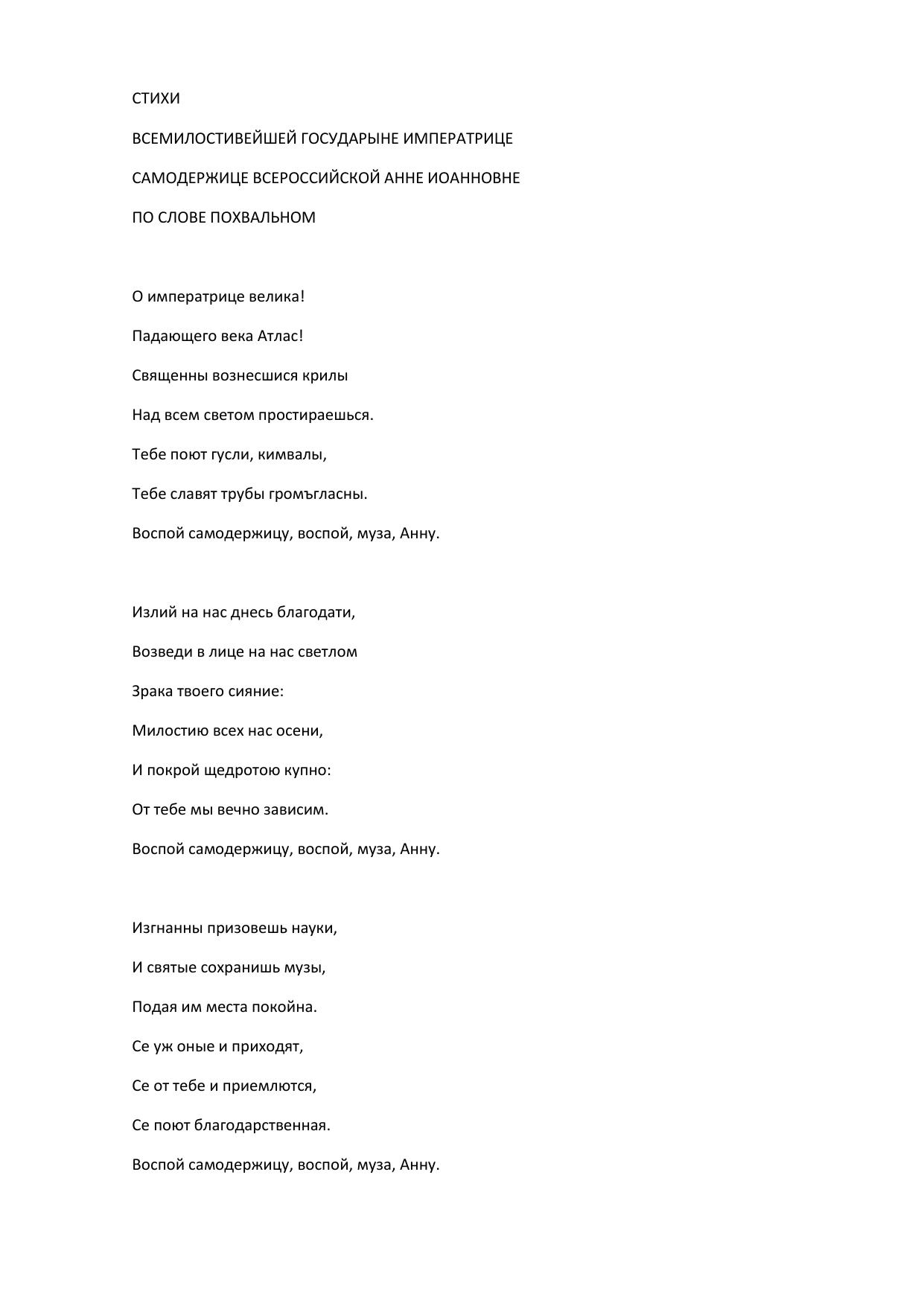 Стихи всемилостивейшей государыне императрице самодержице всероссийской Анне Иоанновне по слове похвальном
