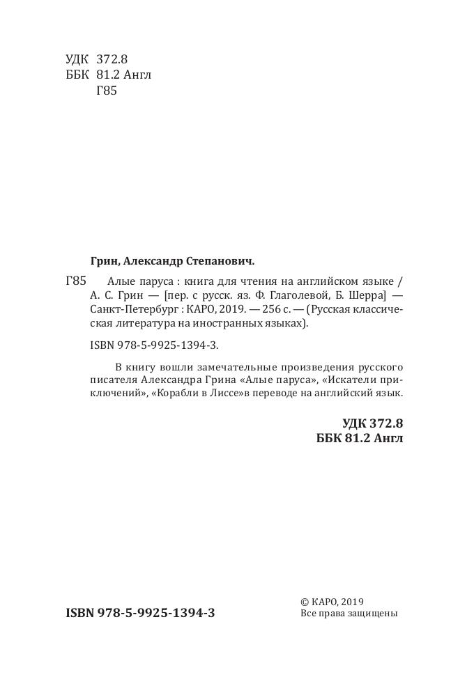 В книгу вошли замечательные произведения русского писателя Александра Грина «Алые паруса», «Искатели приключений», «Корабли в Лиссе»в переводе на английский язык.