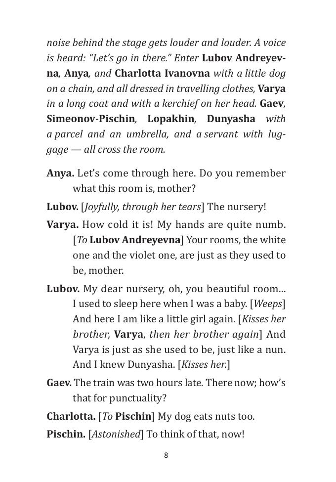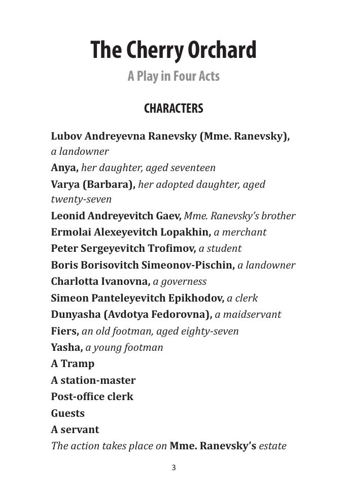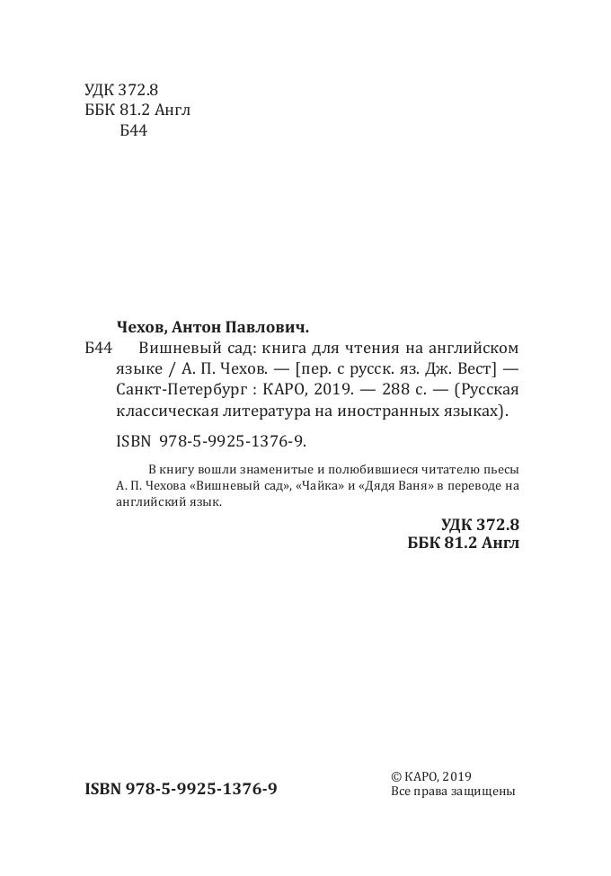 В книгу вошли знаменитые и полюбившиеся читателю пьесы А. П. Чехова «Вишневый сад», «Чайка» и «Дядя Ваня» в переводе на английский язык.