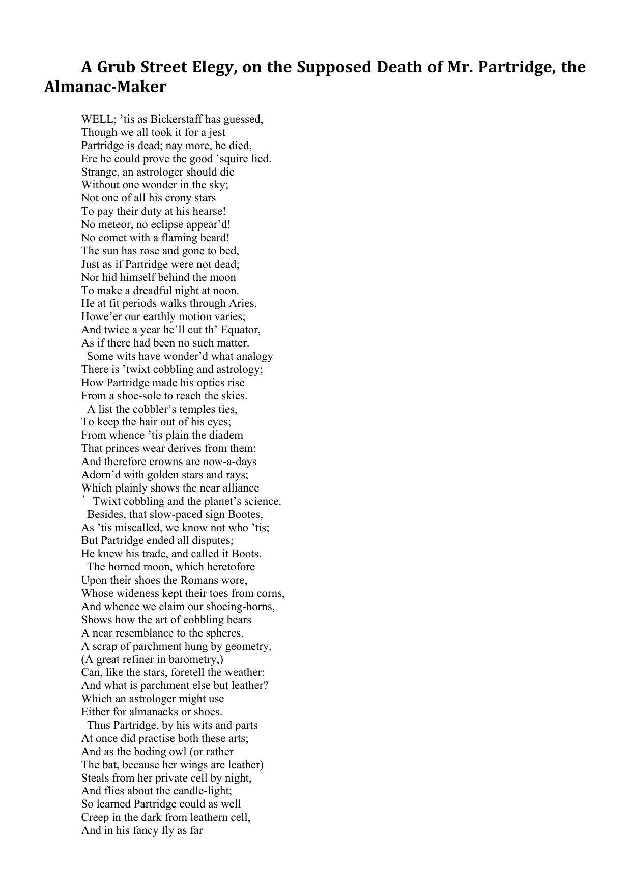A Grub Street Elegy, on the Supposed Death of Mr. Partridge, the Almanac-Maker