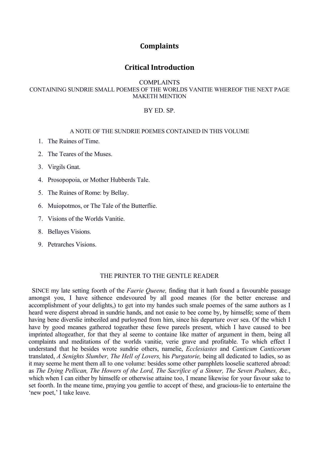 Complaints, Containing sundrie small Poemes of the Worlds Vanitie