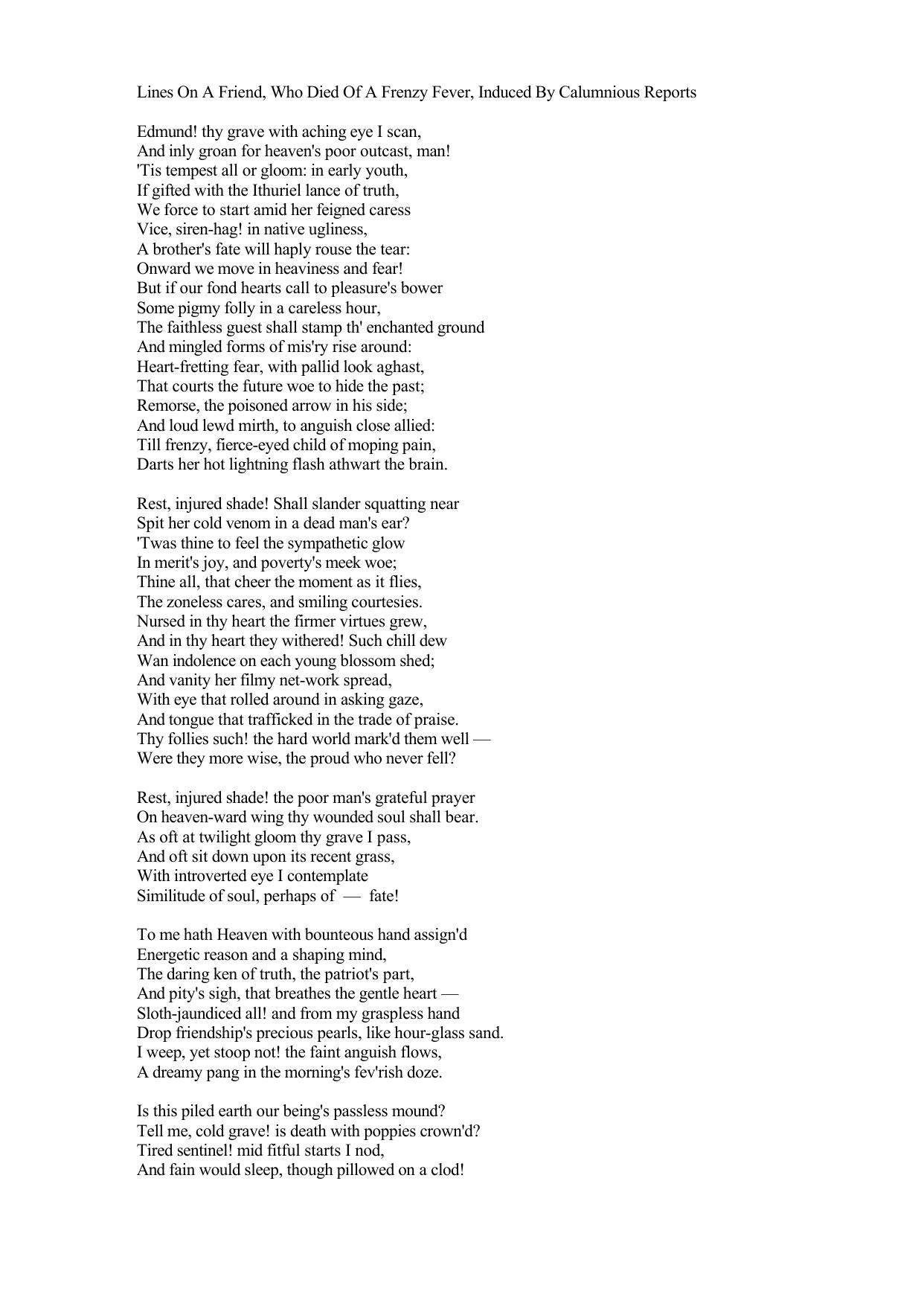 Lines On A Friend, Who Died Of A Frenzy Fever, Induced By Calumnious Reports