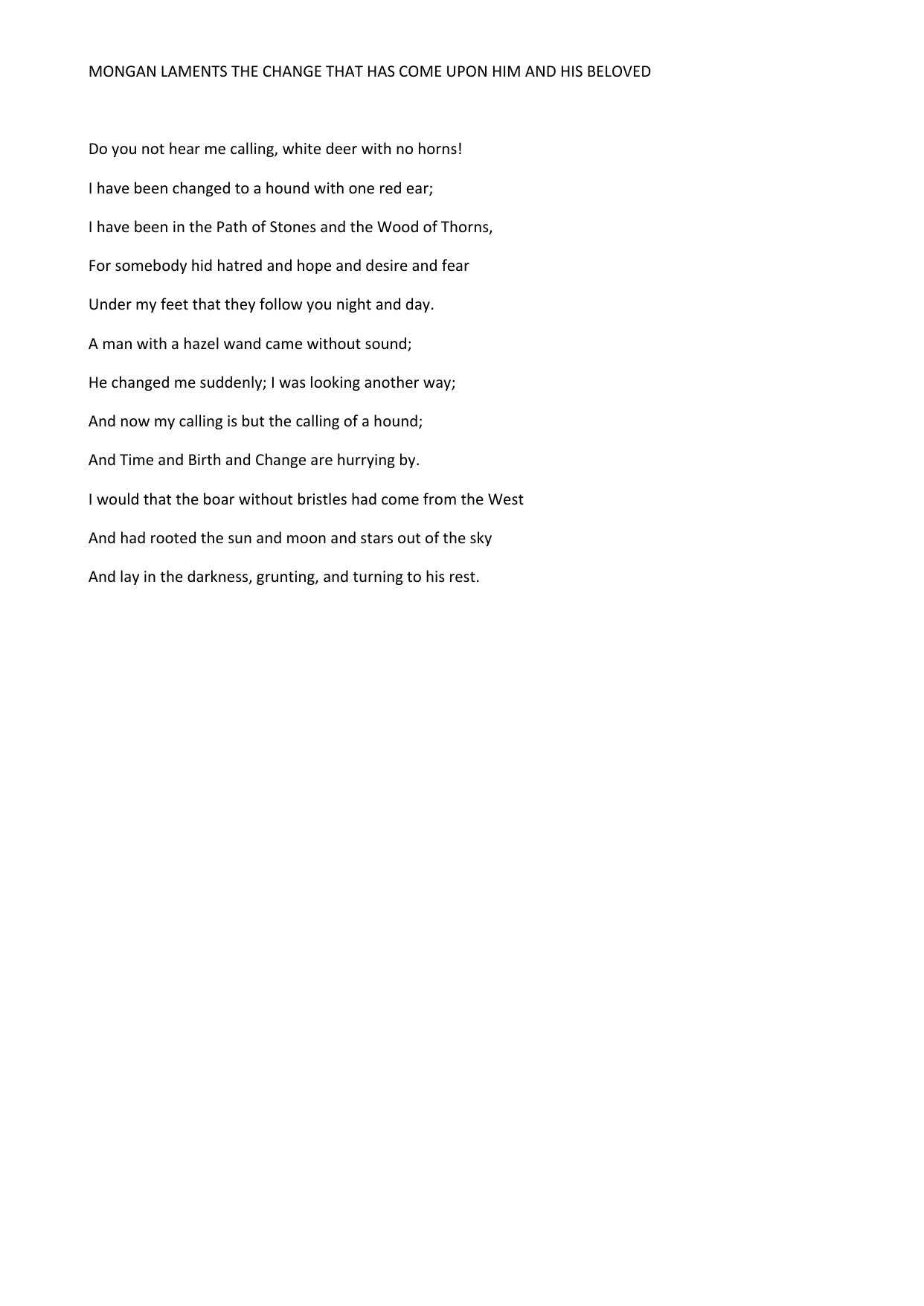 Mongan laments the Change that has come upon him and his Beloved