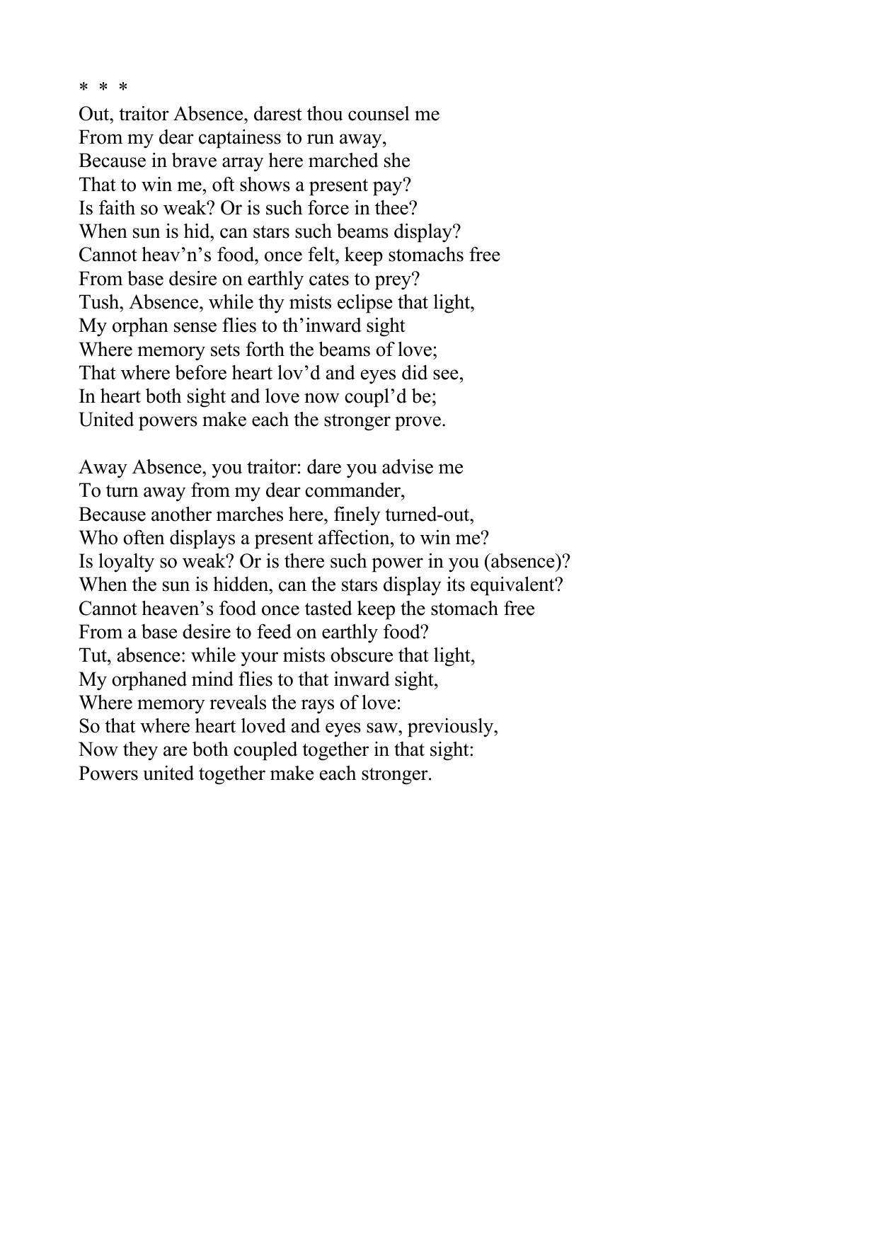 Out, traitor Absence, darest thou counsel me