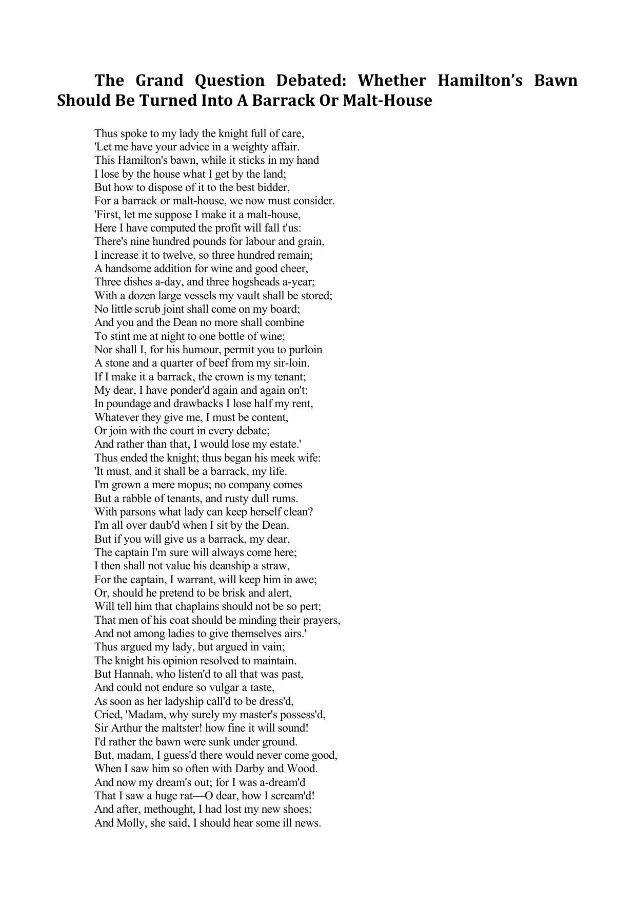 The Grand Question debated Whether Hamilton's Bawn should be turned into a Barrack or a Malt House