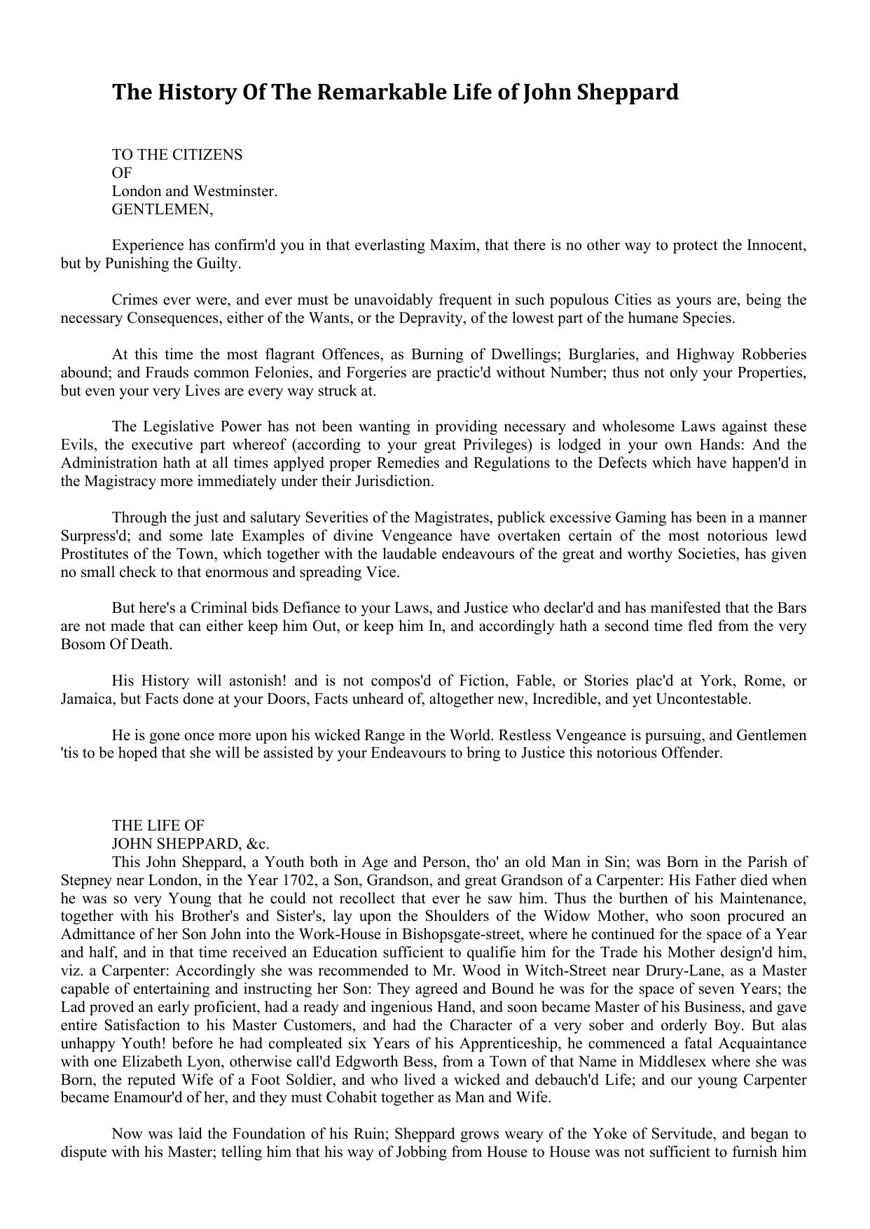 The History Of The Remarkable Life of John Sheppard