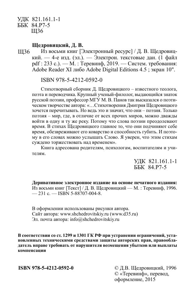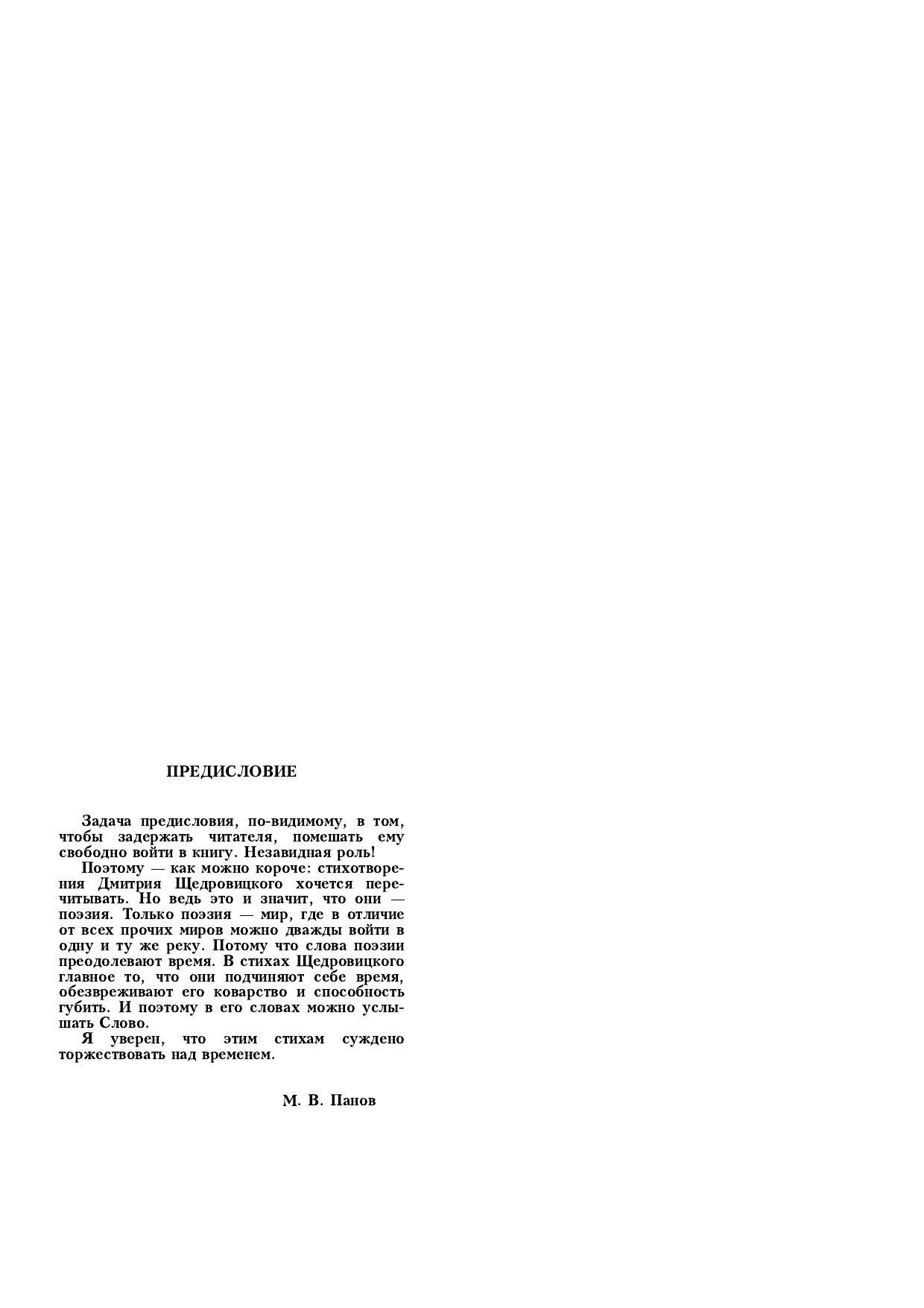 Стихотворный сборник Д. Щедровицкого — известного теолога, поэта и переводчика. Крупный ученый-филолог, выдающийся знаток русской поэзии, профессор МГУ М. В. Панов так высказался о поэтическом творчестве автора: «...Стихотворения Дмитрия Щедровицкого хочется перечитывать. Но ведь это и значит, что они — поэзия. Только поэзия — мир, где, в отличие от всех прочих миров, можно дважды войти в одну и ту же реку. Потому что слова поэзии преодолевают время. В стихах Щедровицкого главное то, что они подчиняют себе время, обезвреживают его коварство и способность губить. И поэтому в его словах можно услышать Слово. Я уверен, что этим стихам суждено торжествовать над временем».