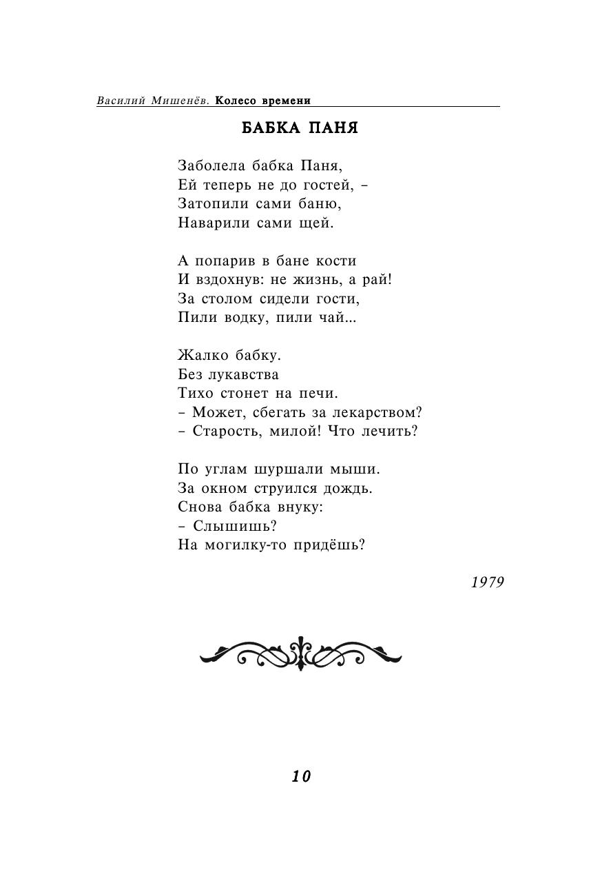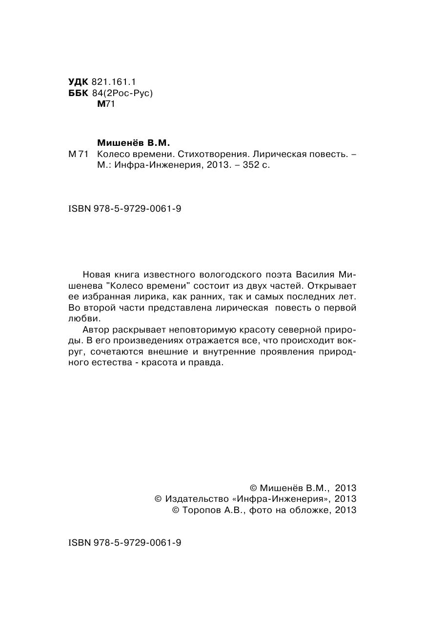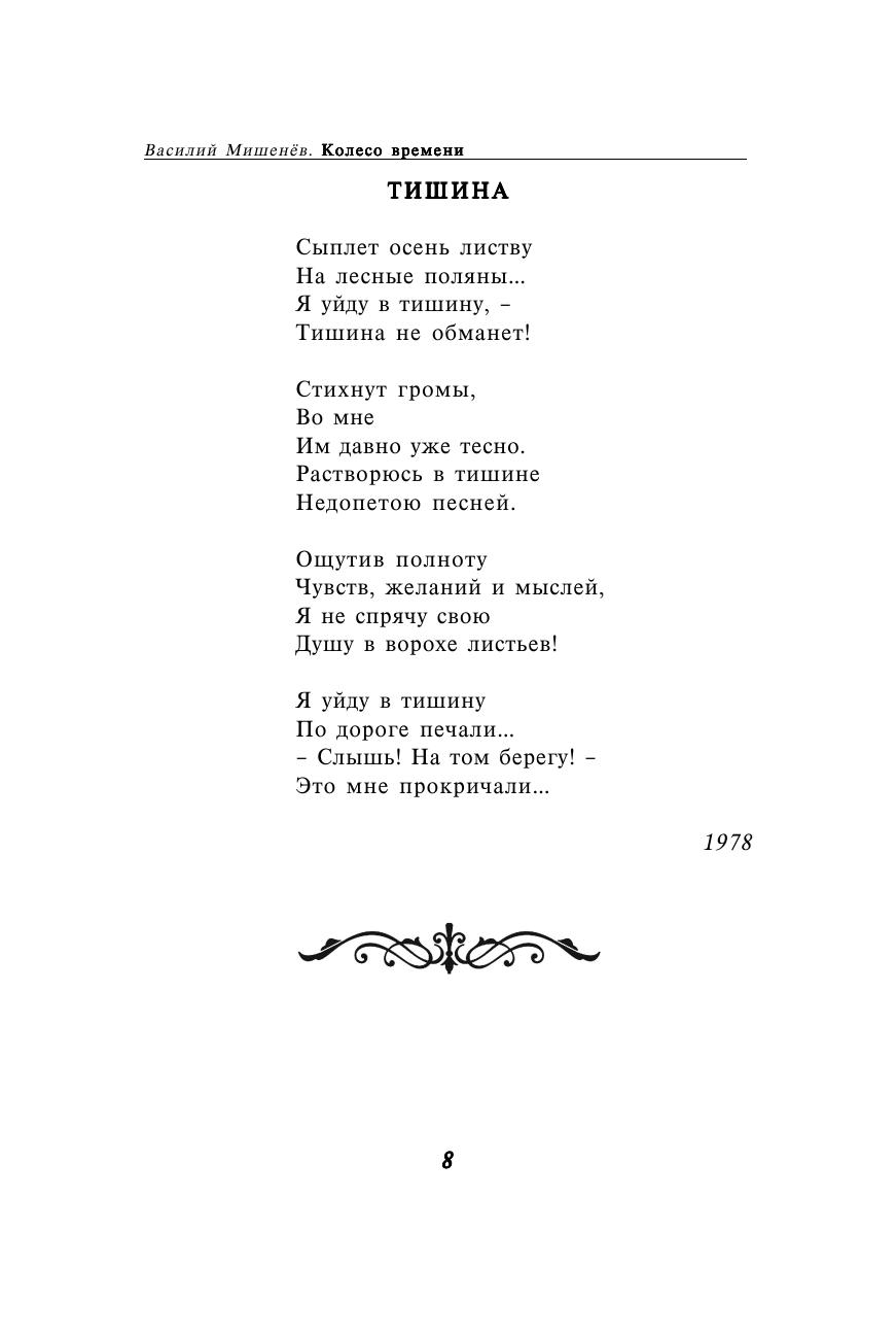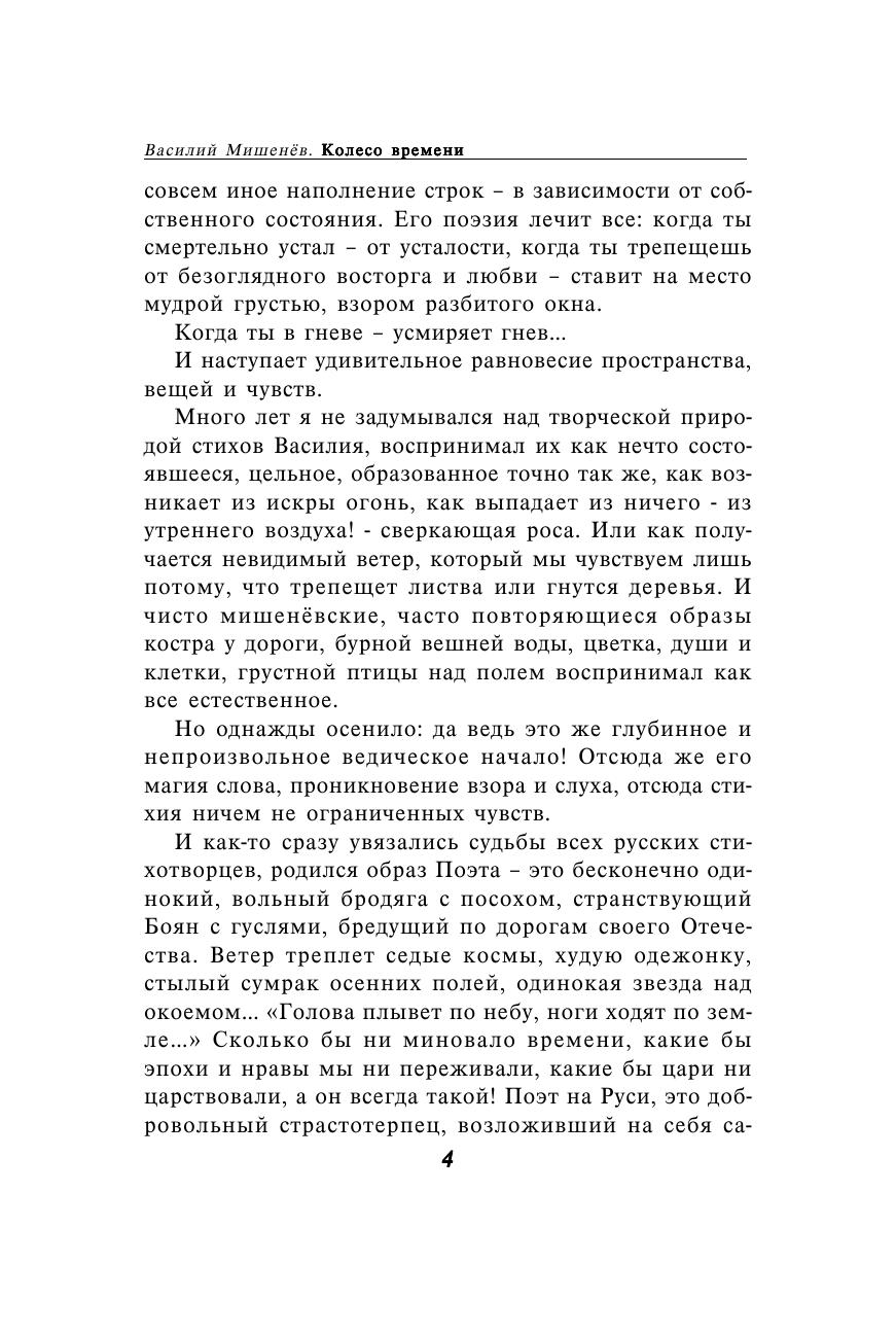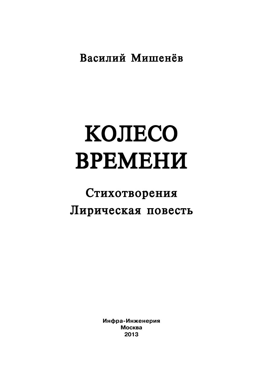 Новая книга известного вологодского поэта Василия Мишенева "Колесо времени" состоит из двух частей. Открывает ее избранная лирика, как ранних, так и самых последних лет. Во второй части представлена лирическая повесть о первой любви. Автор раскрывает неповторимую красоту северной природы. В его произведениях отражается все, что происходит вокруг, сочетаются внешние и внутренние проявления природного естества - красота и правда.
