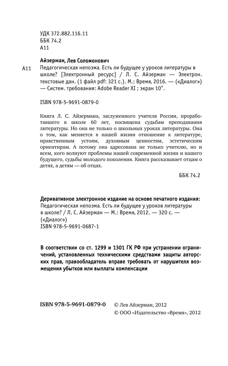 Книга Л. С. Айзермана, заслуженного учителя России, проработавшего в школе 60 лет, посвящена судьбам преподавания литературы. Но она не только о школьных уроках литературы. Она о том, как меняется в нашей жизни отношение к литературе, нравственным устоям, духовным ценностям, эстетическим ориентирам. А потому она адресована не только учителю, но и всем, кого волнуют проблемы нашей современной жизни и нашего будущего, судьбы молодого поколения. Книга рассказывает отцам о детях, а детям — об отцах.