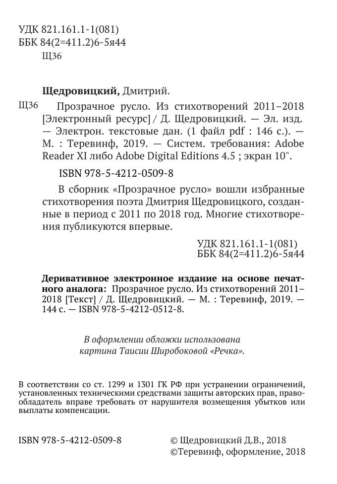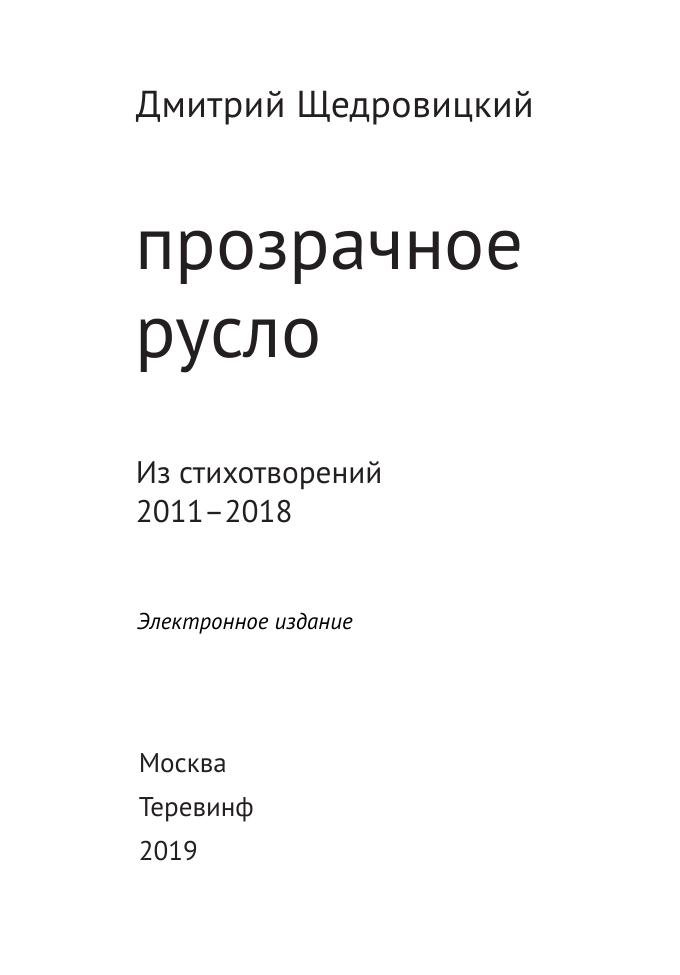 В сборник «Прозрачное русло» вошли избранные стихотворения поэта Дмитрия Щедровицкого, созданные в период с 2011 по 2018 год. Многие стихотворения публикуются впервые.