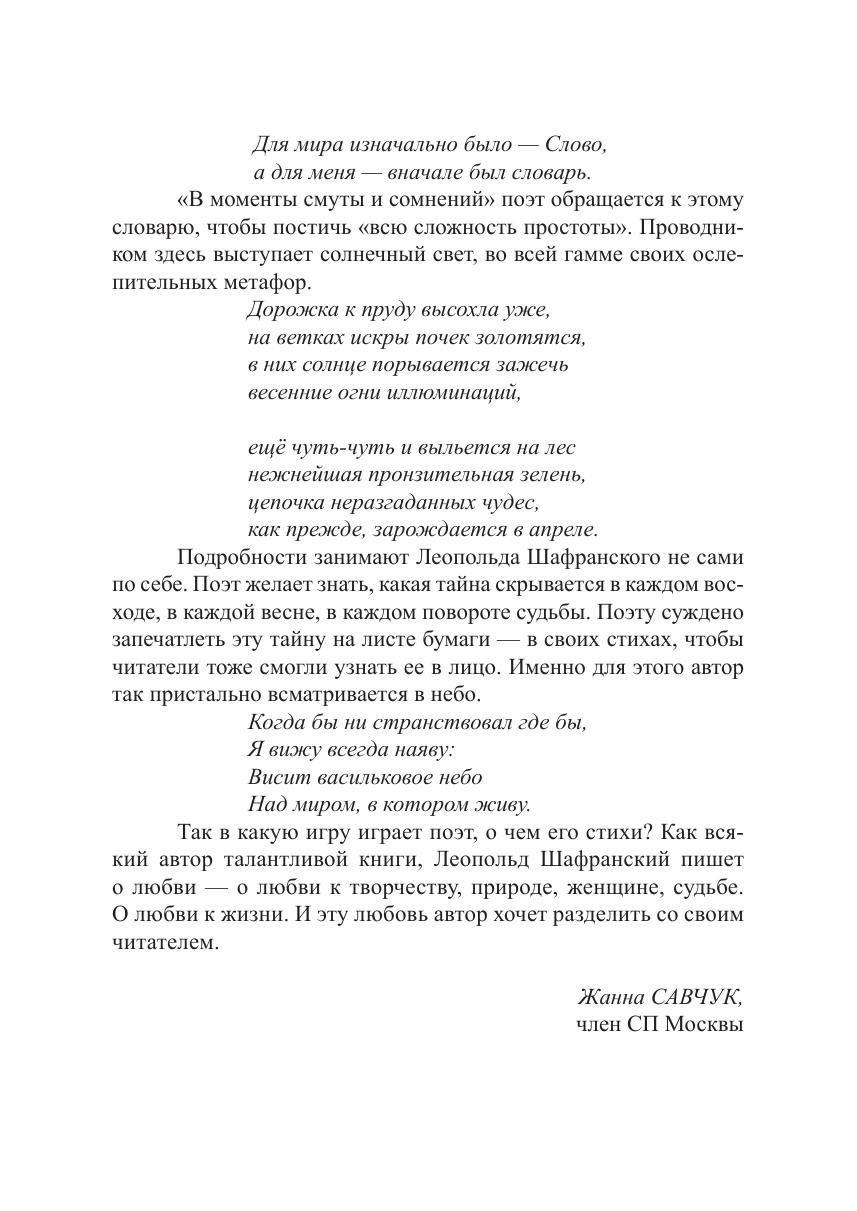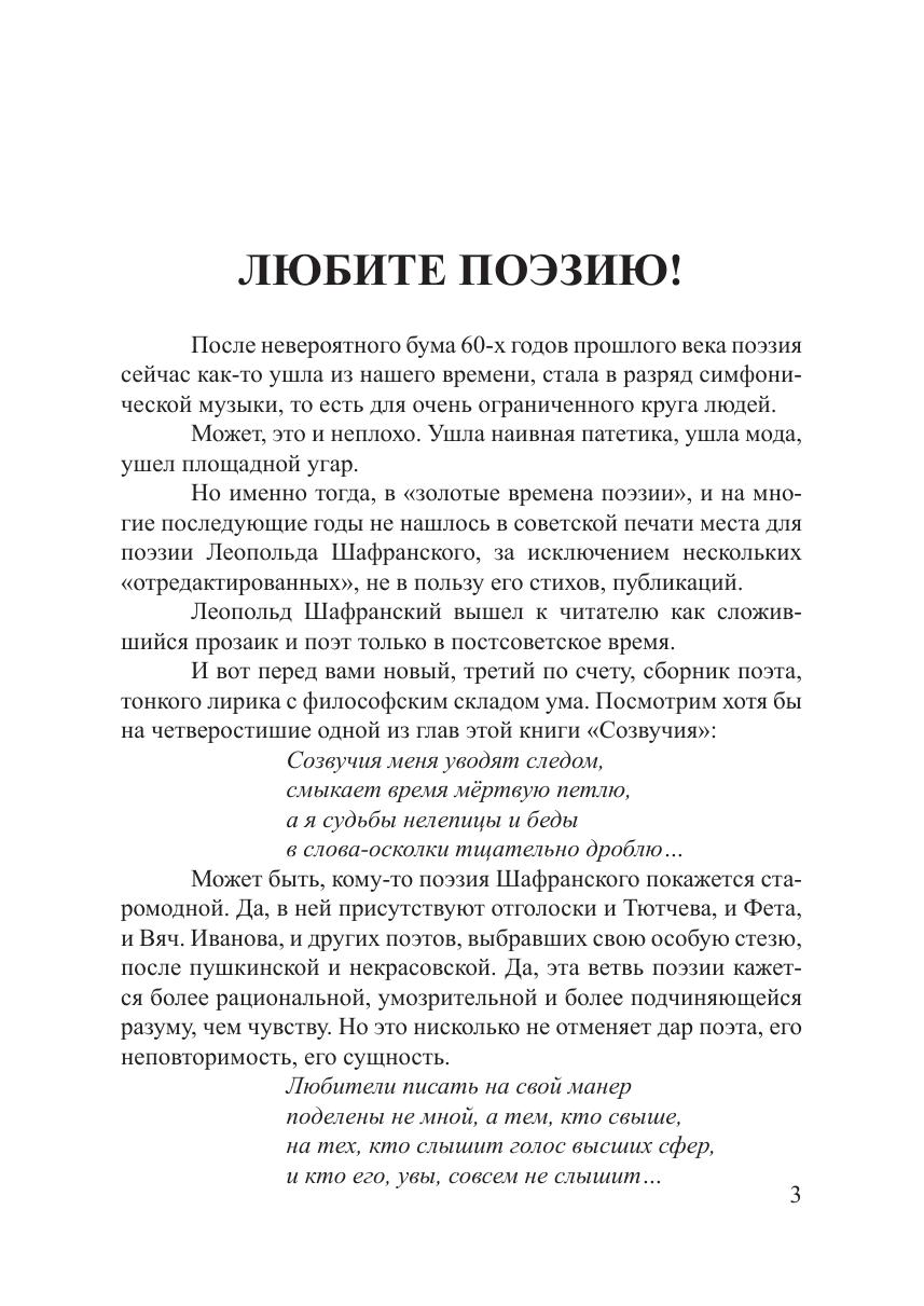 Это третья книга поэтических произведений члена Союза писателей Москвы Л. В. Шафранского. Ранее его стихи публиковались в различных сборниках, в 2004 году была издана первая книга «В пространстве заоконном», а в 2014 году — книга «Любимая, осень…». Автор выражает благодарность В. Н. Филатову и Т. П. Гулевич за помощь в издании этой книги.