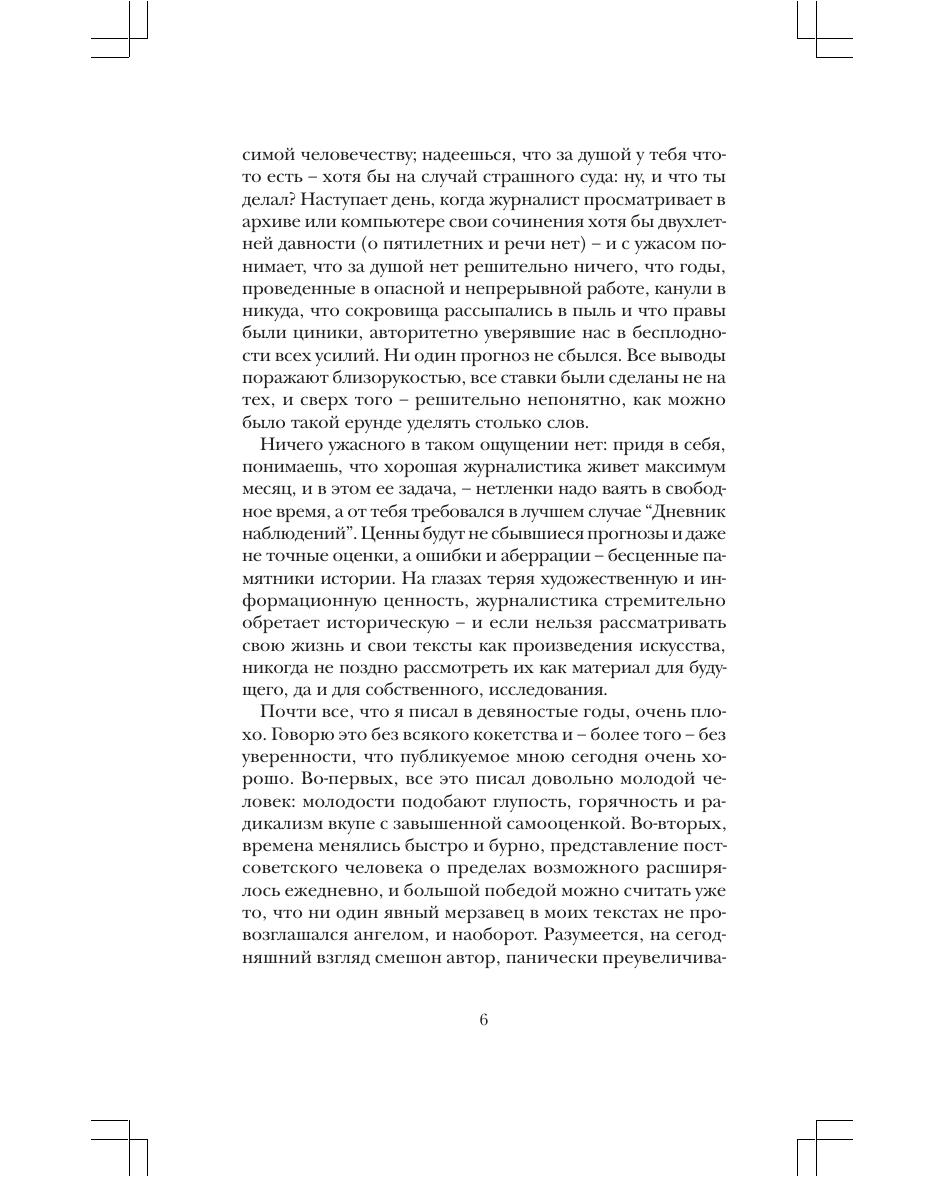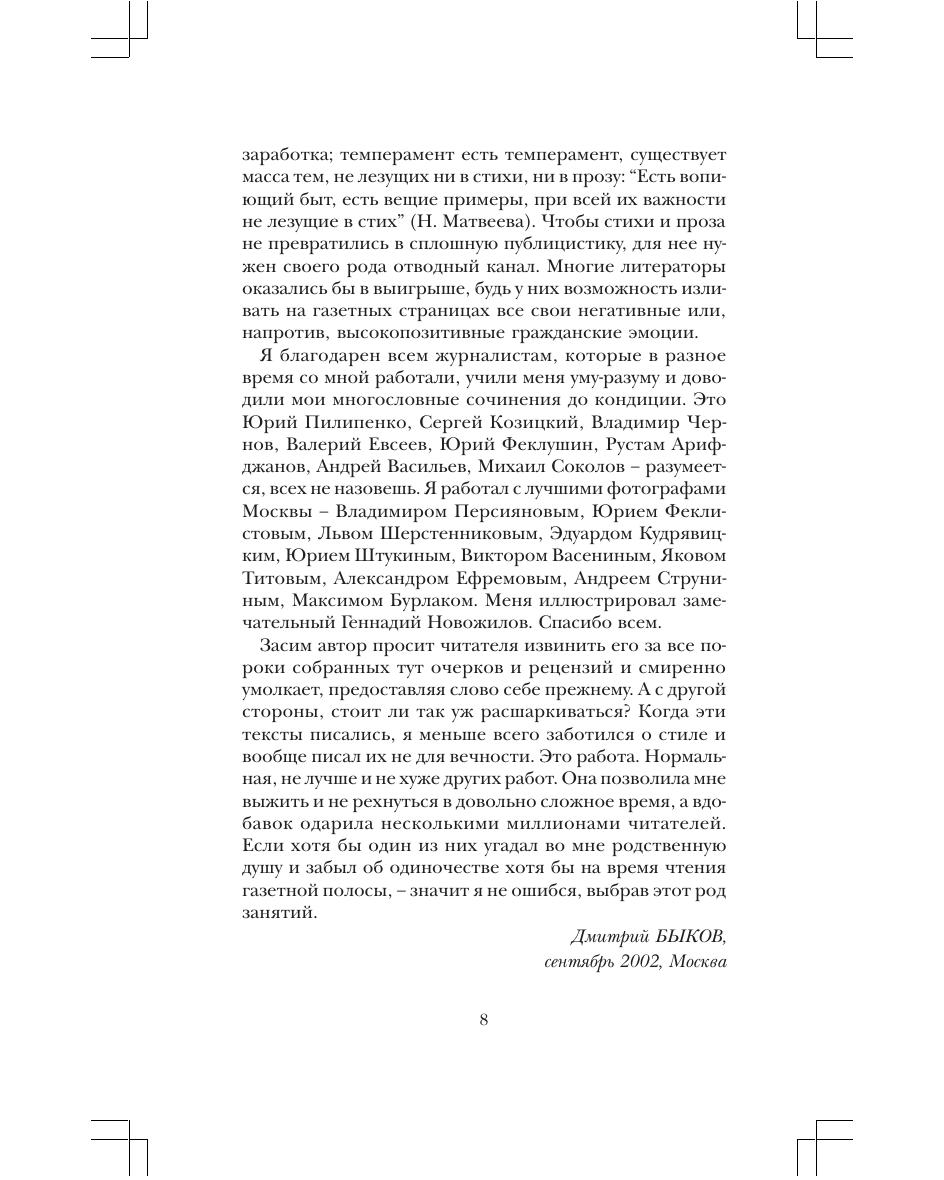Статьи известного публициста, поэта, прозаика Дмитрия Быкова неизменно вызывают критику как справа, так и слева – и делают тираж изданиям, в которых он печатается. Вне зависимости от политической и эстетической конъюнктуры, он, будучи носителем здравого смысла, называет белое белым, а черное – черным, чтобы по этому поводу ни говорили другие инстанции вкуса. Собранное в этой книге – лучшее, что написал Быков о русской литературе, кино, политике, медиа, общественных спорах XX века. Перед нами авторская энциклопедия русской жизни, написанная блистательно талантливым человеком.