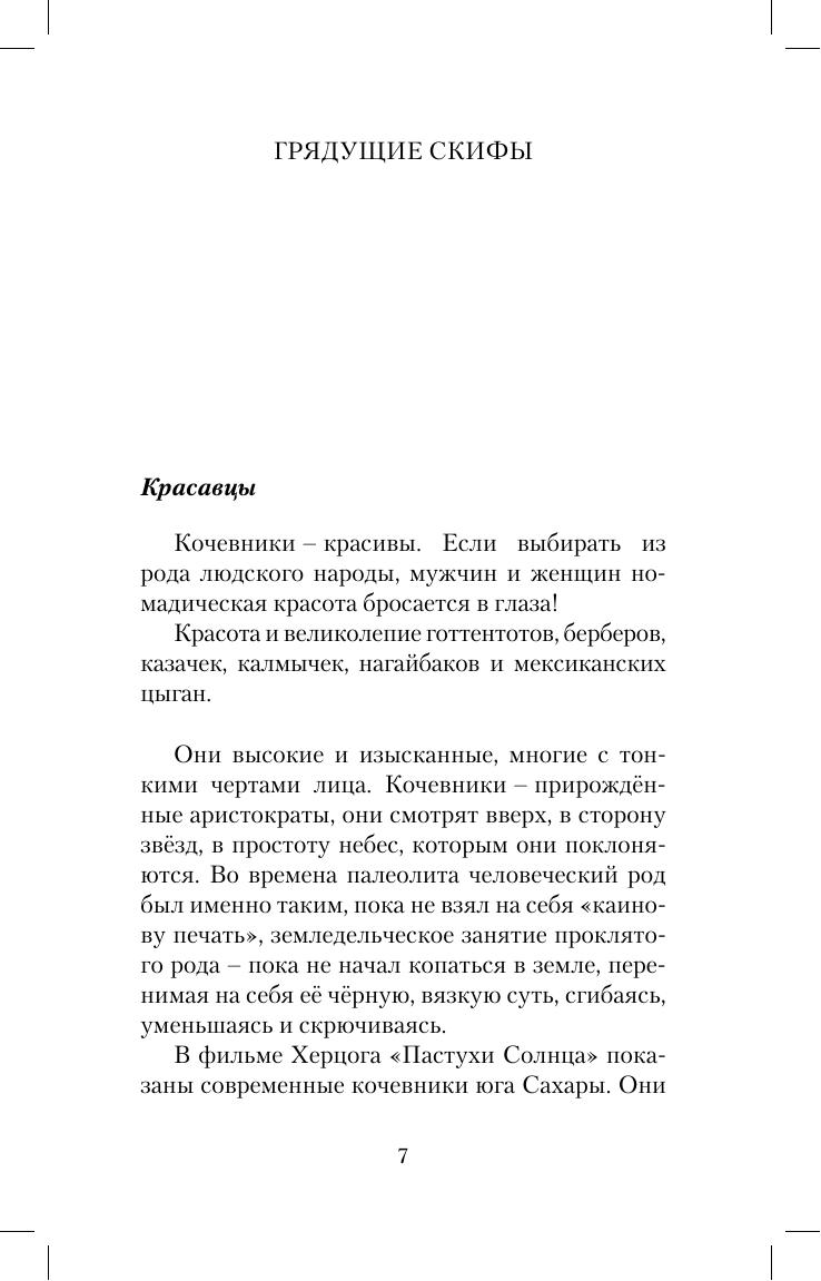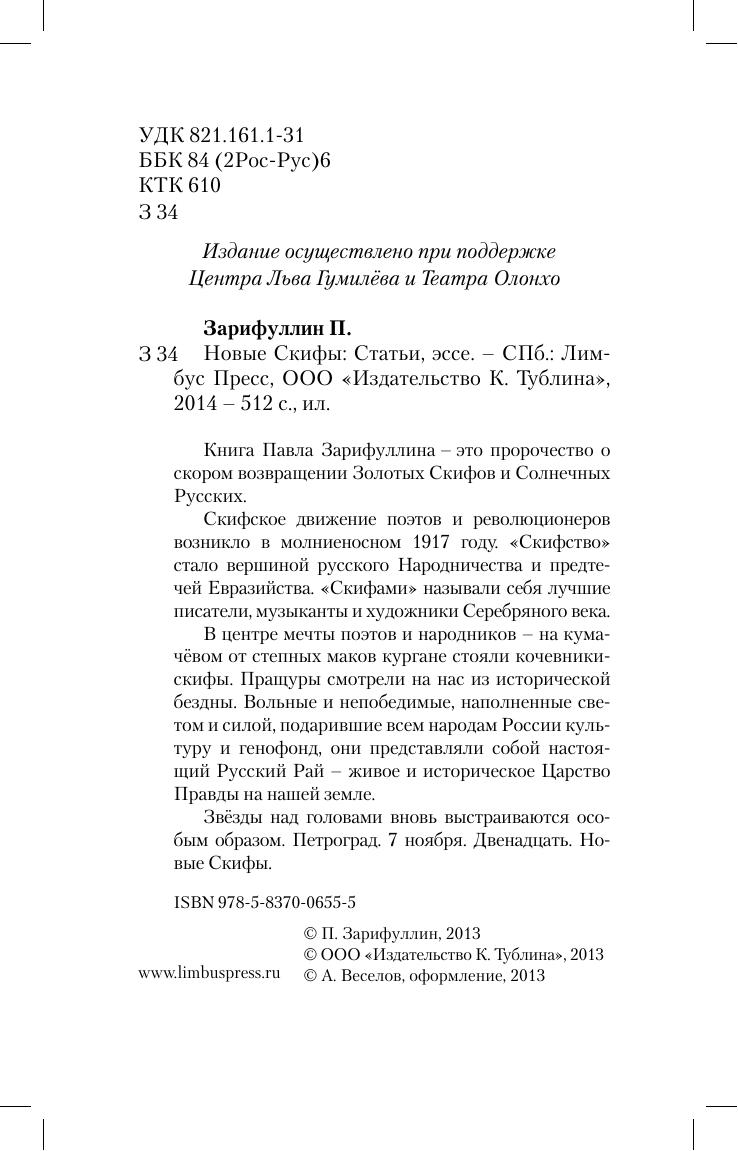 Книга Павла Зарифуллина – это пророчество о скором возвращении Золотых Скифов и Солнечных Русских. Скифское движение поэтов и революционеров возникло в молниеносном 1917 году. «Скифство» стало вершиной русского Народничества и предтечей евразийства. «Скифами» называли себя лучшие писатели, музыканты и художники Серебряного века. В центре мечты поэтов и народников – на кумачёвом от степных маков кургане стояли кочевники-скифы. Пращуры смотрели на нас из исторической бездны. Вольные и непобедимые, наполненные светом и силой, подарившие всем народам России культуру и генофонд, они представляли собой настоящий Русский Рай – живое и историческое Царство Правды на нашей земле. Звёзды над головами вновь выстраиваются особым образом. Петроград. 7 ноября. Двенадцать . Новые Скифы.