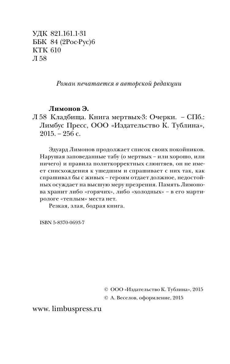 Эдуард Лимонов продолжает список своих покойников. Нарушая заповеданные табу (о мертвых – или хорошо, или ничего) и правила политкорректных слюнтяев, он не имеет снисхождения к ушедшим и спрашивает с них так, как спрашивал бы с живых – героям отдает должное, недостойных осуждает на высшую меру презрения. Память Лимонова хранит либо «горячих», либо «холодных» – в его мартирологе «теплым» места нет.