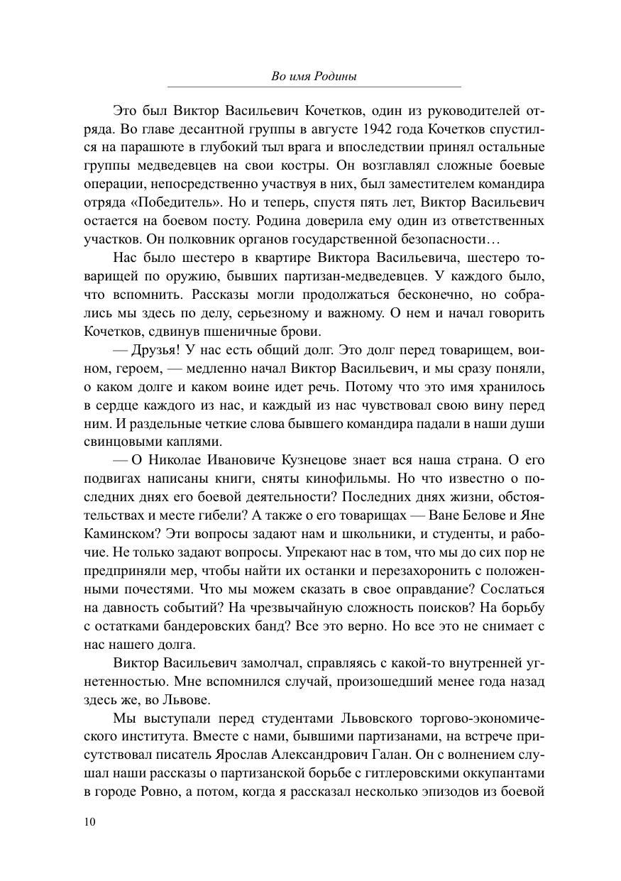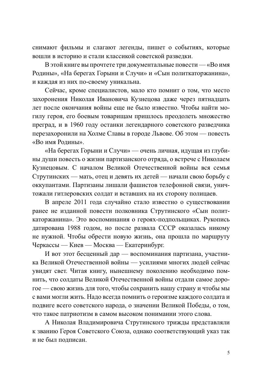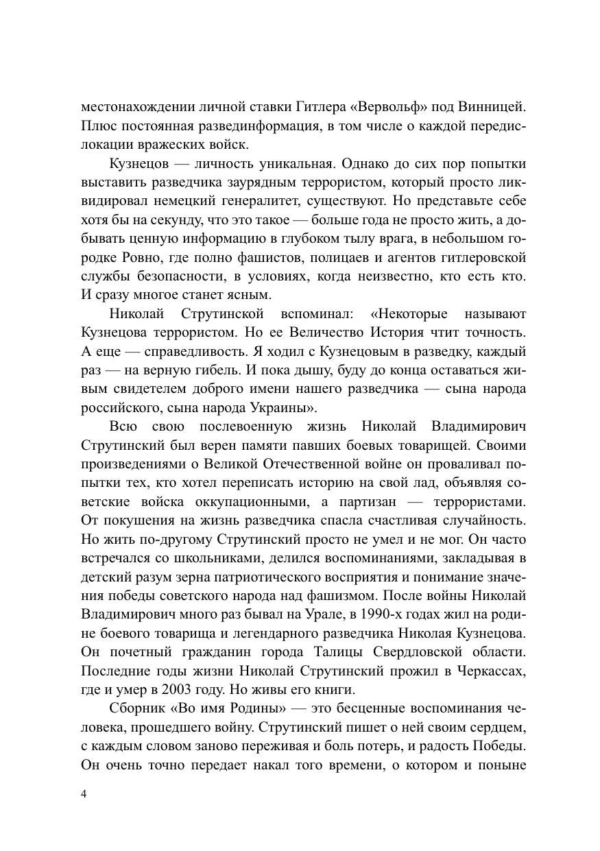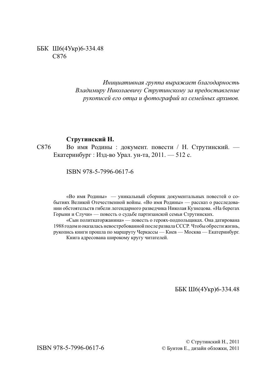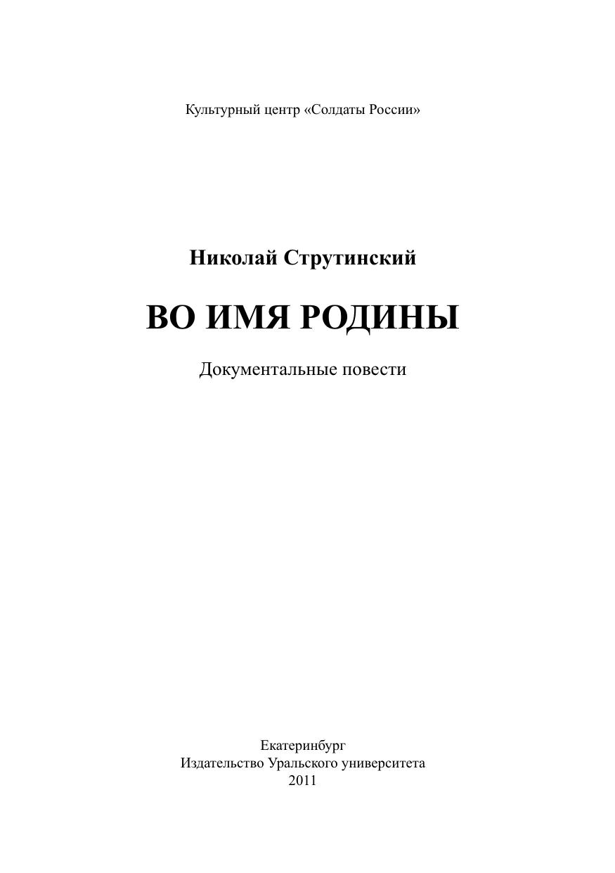 «Во имя Родины» — уникальный сборник документальных повестей о событиях Великой Отечественной войны. «Во имя Родины» — рассказ о расследовании обстоятельств гибели легендарного разведчика Николая Кузнецова. «На берегах Горыни и Случи» — повесть о судьбе партизанской семьи Струтинских. «Сын политкаторжанина» — повесть о героях-подпольщиках. Она датирована 1988 годом и оказалась невостребованной после развала СССР. Чтобы обрести жизнь, рукопись книги прошла по маршруту Черкассы — Киев — Москва — Екатеринбург. Книга адресована широкому кругу читателей.