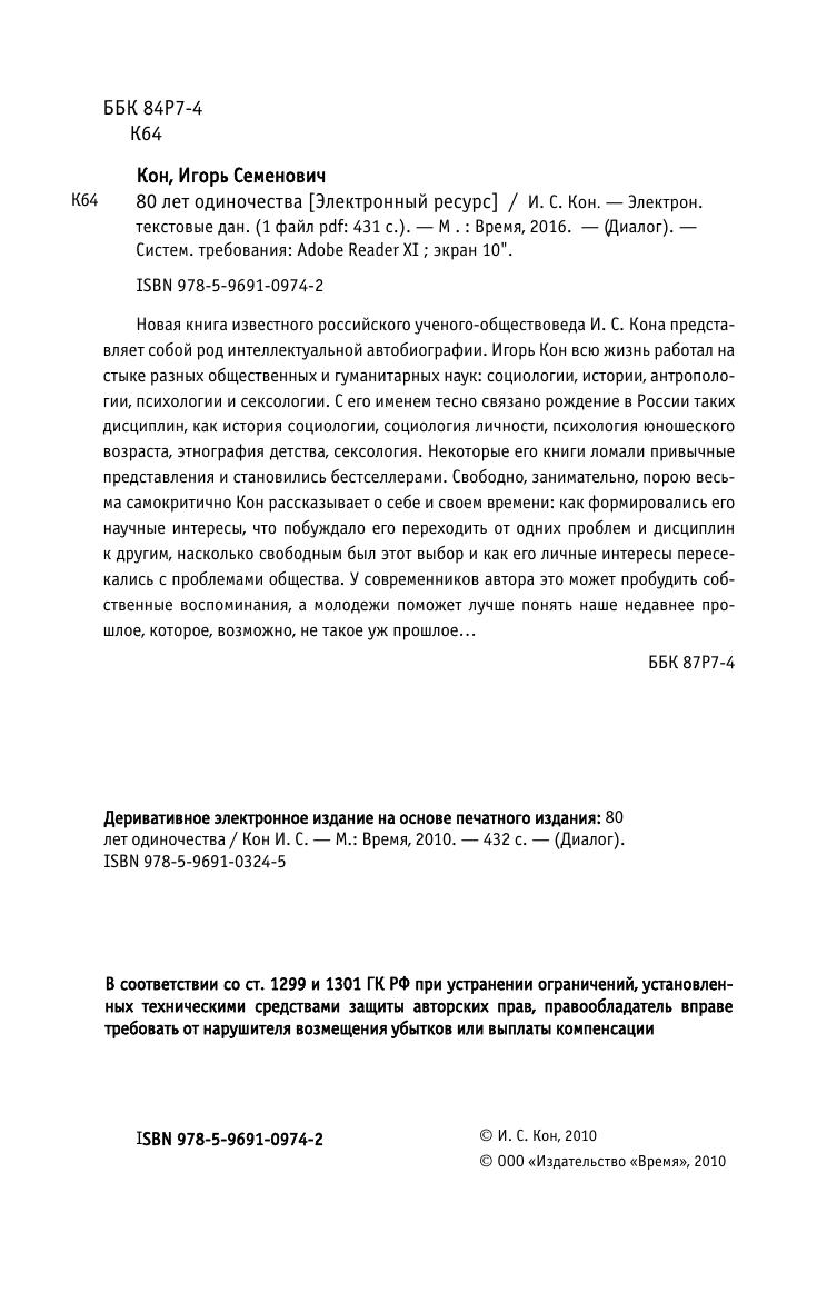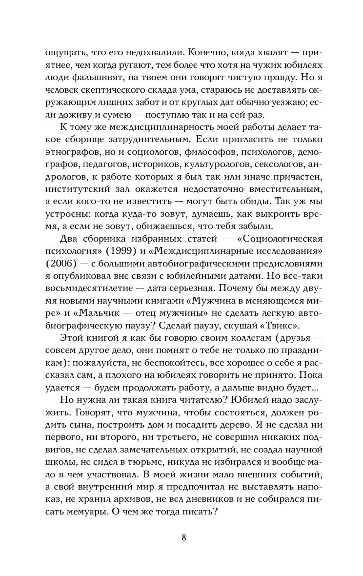 Книга известного российского ученого-обществоведа И.С.Кона представляет собой род интеллектуальной автобиографии. Игорь Кон всю жизнь работал на стыке разных общественных и гуманитарных наук: социологии, истории, антропологии, психологии и сексологии. С его именем тесно связано рождение в России таких дисциплин, как история социологии, социология личности, психология юношеского возраста, этнография детства, сексология. Некоторые его книги ломали привычные представления и становились бестселлерами. Свободно, занимательно, порою весьма самокритично Кон рассказывает о себе и своем времени: как формировались его научные интересы, что побуждало его переходить от одних проблем и дисциплин к другим, насколько свободным был этот выбор и как его личные интересы пересекались с проблемами общества. У современников автора это может пробудить собственные воспоминания, а молодежи поможет лучше понять наше недавнее прошлое, которое, возможно, не такое уж прошлое…