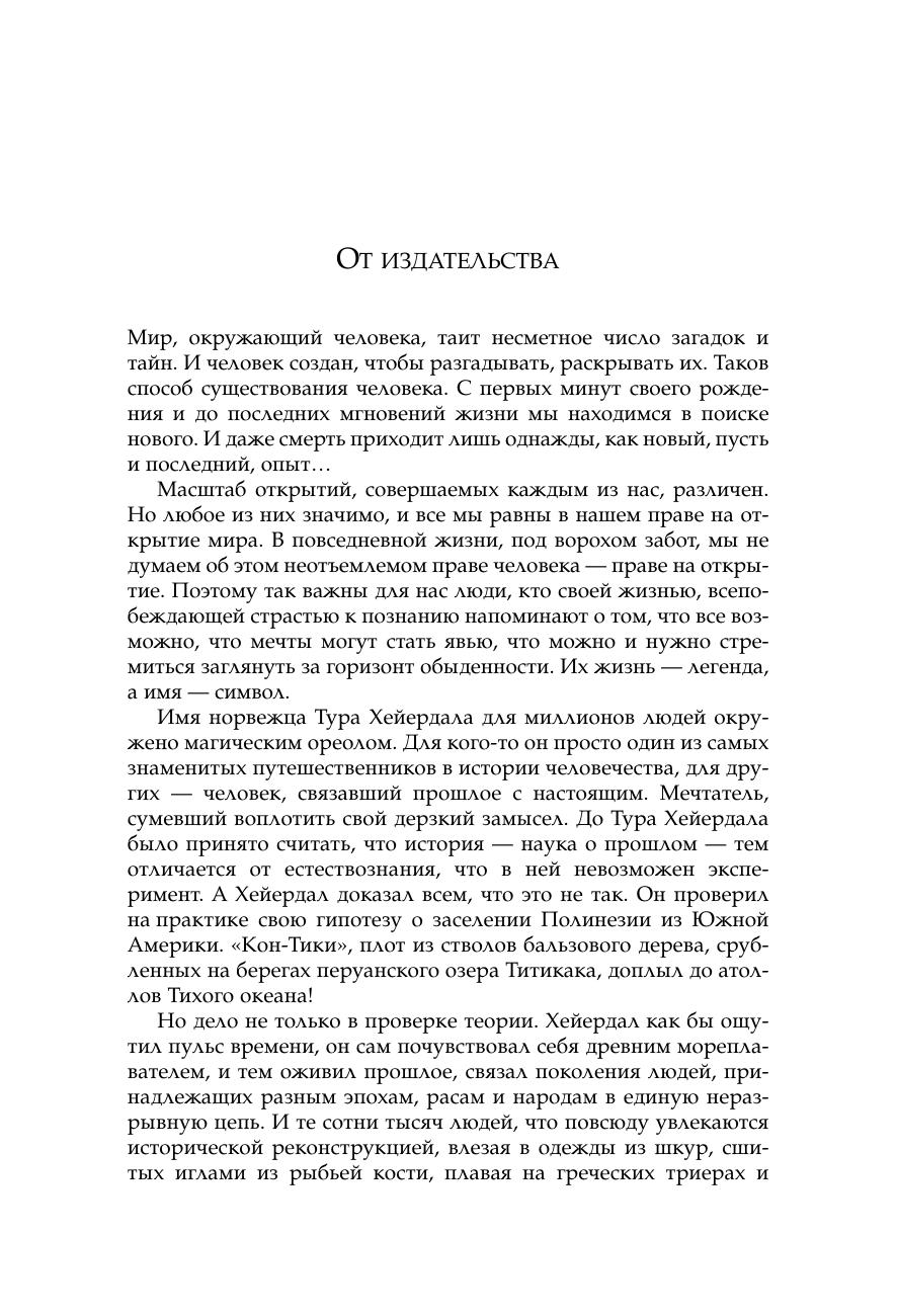 те. Его книги переведены на многие языки мира. Перед нами первая подробная биография известного путешественника, которая охватывает всю его жизнь и карьеру, а также знакомит нас с его личностью. Настоящий том посвящен наименее известному широкой публике периоду жизни — с 1914 по 1947 г. — до путешествия на «Кон Тики». Используемые официальные источники, письма, дневники, личные записи, воспоминания друзей и родственников показывают, в какой среде рос и формировался будущий знаменитый путешественник, что повлияло на выбор его жизненного пути, как развивалось его мировоззрение, и возникали его оригинальные теории, как шел он к своему успеху, как складывалась его личная жизнь. Книга снабжена научно справочным аппаратом, фотографиями, рисунками и картами.