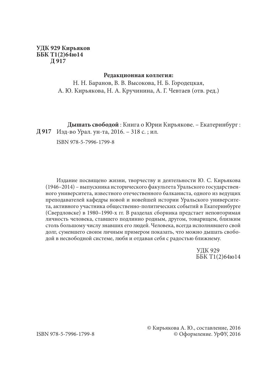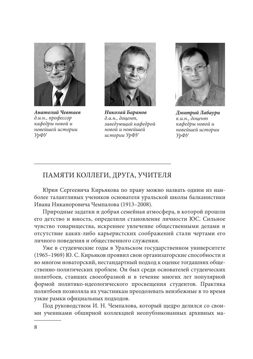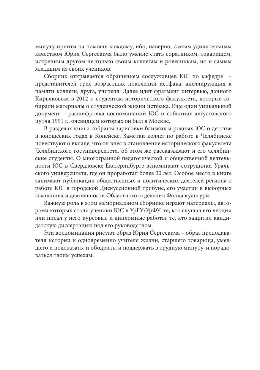 Издание посвящено жизни, творчеству и деятельности Ю. С. Кирьякова (1946–2014) – выпускника исторического факультета Уральского государственного университета, известного отечественного балканиста, одного из ведущих преподавателей кафедры новой и новейшей истории Уральского университета, активного участника общественно-политических событий в Екатеринбурге (Свердловске) в 1980–1990-х гг. В разделах сборника предстает неповторимая личность человека, ставшего подлинно родным, другом, товарищем, близким столь большому числу знавших его людей. Человека, всегда исполнявшего свой долг, сумевшего своим личным примером показать, что можно дышать свободой в несвободной системе, любя и отдавая себя с радостью ближнему.
