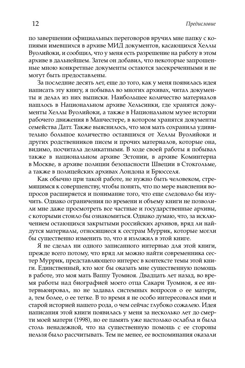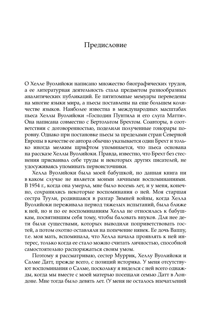 Яркая и многогранная жизнь знаменитой финской писательницы (цикл «Нискавуори» и др.) и близкой к коммунистическому движению общественной деятельницы Хеллы Вуолийоки (1886–1954) является объектом постоянного интереса в Финляндии. В значительной мере это относится и к ее сестре Салме. Сестры, урожденные Муррик, родились в Эстонии, но в Финляндии завершили образование и состоялись как личности. Младшая, Салме, находясь в тени своей знаменитой сестры, стала женой и верным соратником руководителя Коммунистической партии Великобритании Р. Палм Датта. Старшая сестра, Хелла, не состояла членом какой либо партии, но придерживалась весьма левых, прокоммунистических взглядов, проявила себя при этом как блестящий литератор (сам Бертольт Брехт был ее соавтором) и хозяйка влиятельного политического салона. В 1943 г. Хелла была осуждена на пожизненное заключение за связи с советской разведкой, но в 1944 г. освобождена и сыграла видную роль в политике и общественной жизни послевоенной Финляндии. Среди близких друзей и хороших знакомых сестер Муррик было не мало самых влиятельных личностей того времени. Жизни Хеллы и Салме