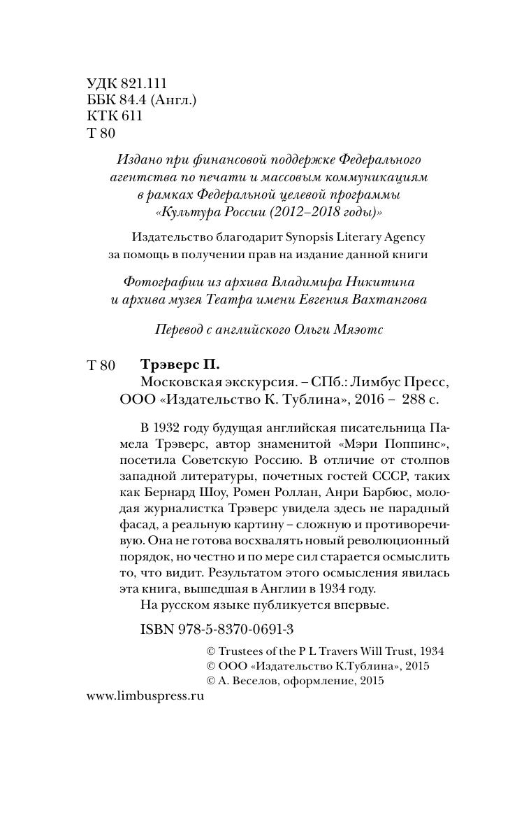 В 1932 году будущая английская писательница Памела Трэверс, автор знаменитой ?Мэри Поппинс?, посетила Советскую Россию. В отличие от столпов западной литературы, почетных гостей СССР, таких как Бернард Шоу, Ромен Роллан, Анри Барбюс, молодая журналистка Трэверс увидела здесь не парадный фасад, а реальную картину – сложную и противоречивую. Она не готова восхвалять новый революционный порядок, но честно и по мере сил старается осмыслить то, что видит. Результатом этого осмысления явилась эта книга, вышедшая в Англии в 1934 году.