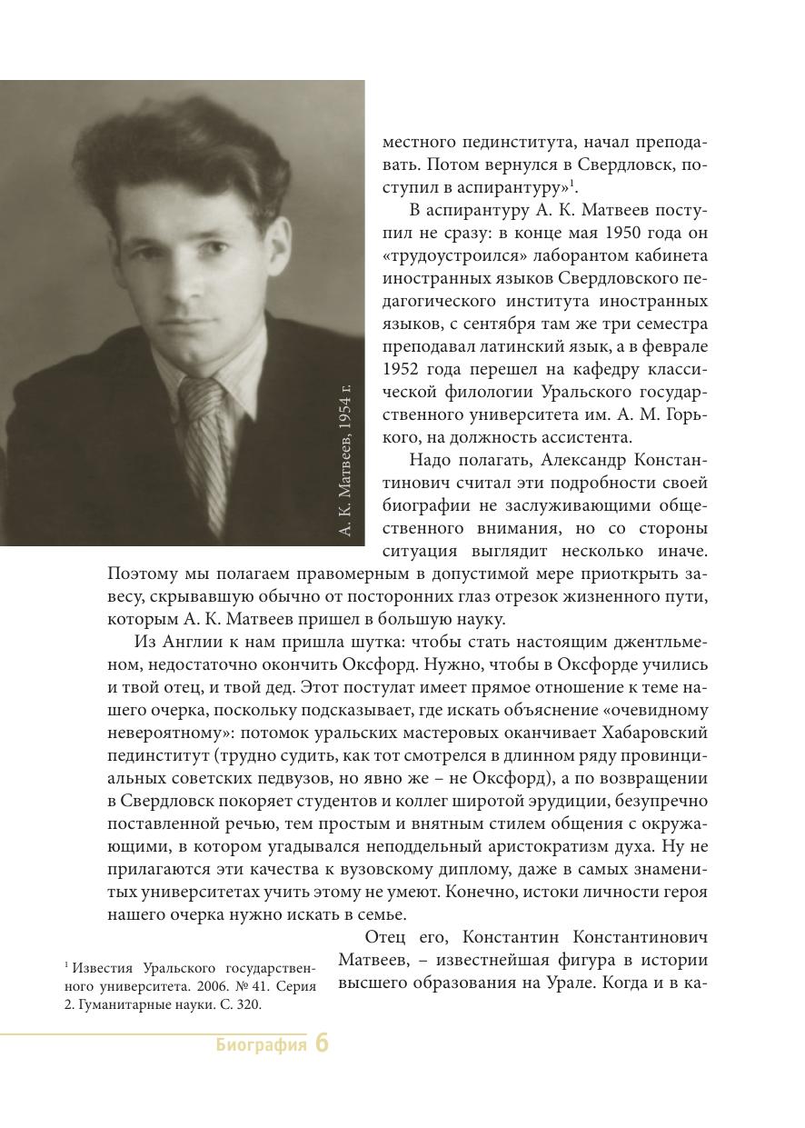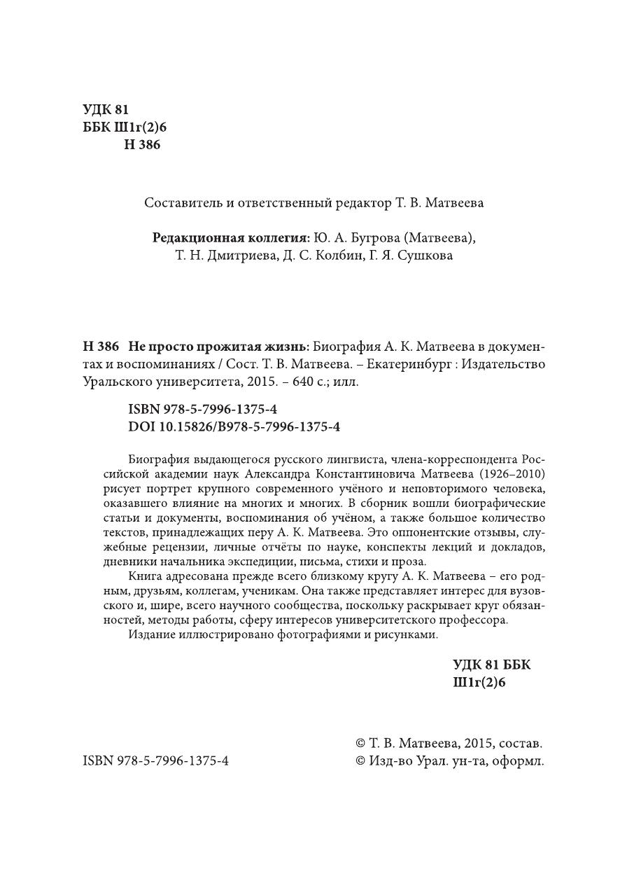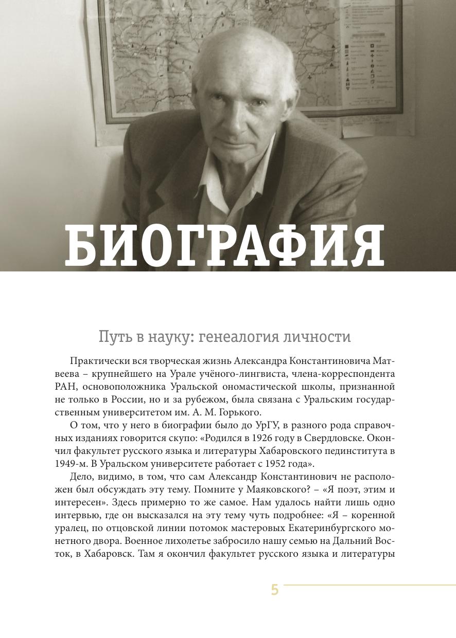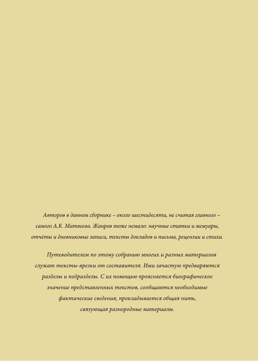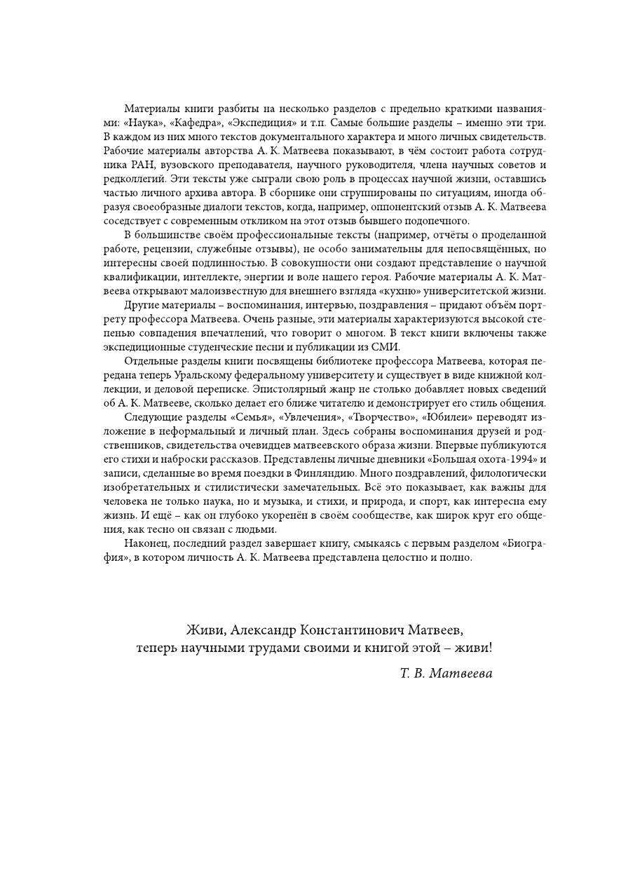 Биография выдающегося русского лингвиста, члена-корреспондента Российской академии наук Александра Константиновича Матвеева (1926-2010) рисует портрет крупного современного учёного и неповторимого человека, оказавшего влияние на многих и многих. В сборник вошли биографические статьи и документы, воспоминания об учёном, а также большое количество текстов, принадлежащих перу А. К. Матвеева. Это оппонентские отзывы, служебные рецензии, личные отчёты по науке, конспекты лекций и докладов, дневники начальника экспедиции, письма, стихи и проза. Книга адресована прежде всего близкому кругу А. К. Матвеева его родным, друзьям, коллегам, ученикам. Она также представляет интерес для вузовского и, шире, всего научного сообщества, поскольку раскрывает круг обязанностей, методы работы, сферу интересов университетского профессора. Издание иллюстрировано фотографиями и рисунками.