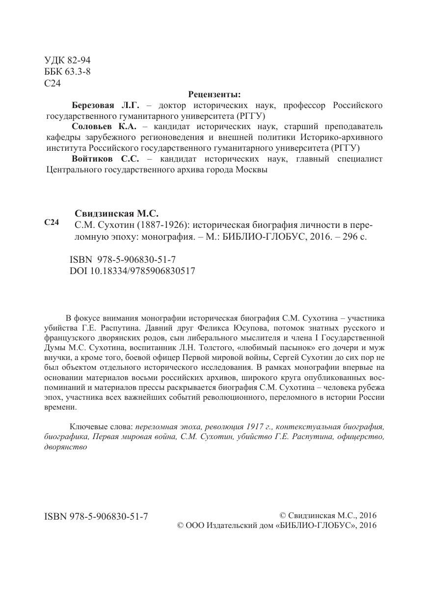 Ключевые слова: переломная эпоха, революция 1917 г., контекстуальная биография, биографика, Первая мировая война, С.М. Сухотин, убийство Г.Е. Распутина, офицерство, дворянство.