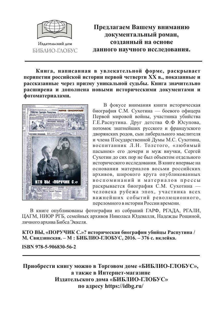 В фокусе внимания монографии историческая биография С.М. Сухотина – участника убийства Г.Е. Распутина. Давний друг Феликса Юсупова, потомок знатных русского и французского дворянских родов, сын либерального мыслителя и члена I Государственной Думы М.С. Сухотина, воспитанник Л.Н. Толстого, «любимый пасынок» его дочери и муж внучки, а кроме того, боевой офицер Первой мировой войны, Сергей Сухотин до сих пор не был объектом отдельного исторического исследования. В рамках монографии впервые на основании материалов восьми российских архивов, широкого круга опубликованных воспоминаний и материалов прессы раскрывается биография С.М. Сухотина – человека рубежа эпох, участника всех важнейших событий революционного, переломного в истории России времени.