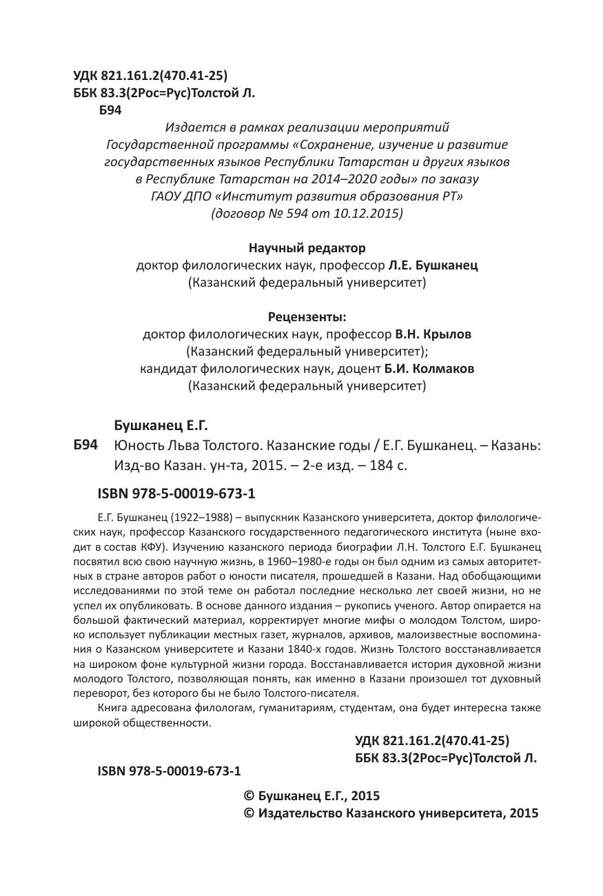 Е.Г. Бушканец (1922–1988) – выпускник Казанского университета, доктор филологических наук, профессор Казанского государственного педагогического института (ныне входит в состав КФУ). Изучению казанского периода биографии Л.Н. Толстого Е.Г. Бушканец посвятил всю свою научную жизнь, в 1960–1980-е годы он был одним из самых авторитетных в стране авторов работ о юности писателя, прошедшей в Казани. Над обобщающими