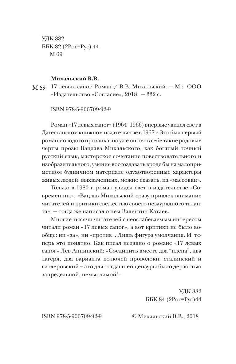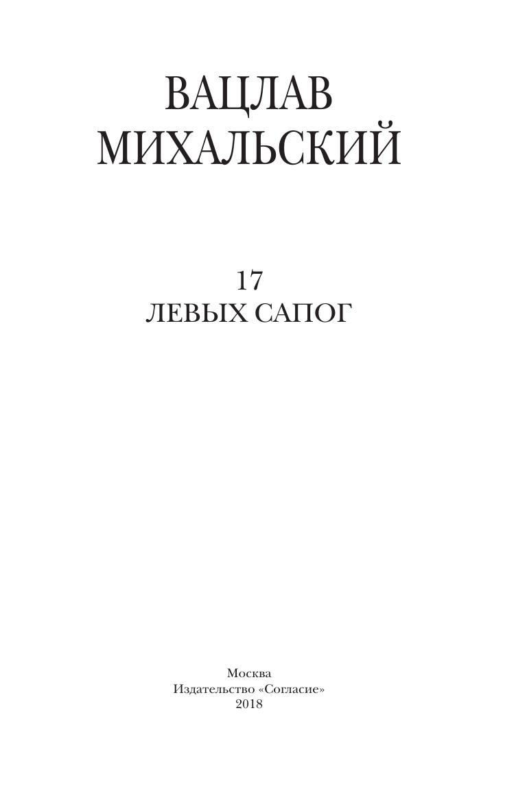 Роман «17 левых сапог» (1964–1966) впервые увидел свет в Дагестанском книжном издательстве в 1967 г. Это был первый роман молодого прозаика, но уже он нес в себе такие родовые черты прозы Вацлава Михальского, как богатый точный русский язык, мастерское сочетание повествовательного и изобразительного, умение воссоздавать вроде бы на малоприметном будничном материале одухотворенные характеры живых людей, выхваченных, можно сказать, из «массовки». Только в 1980 г. роман увидел свет в издательстве «Современник». «Вацлав Михальский сразу привлек внимание читателей и критики свежестью своего незаурядного таланта», — тогда же написал о нем Валентин Катаев.