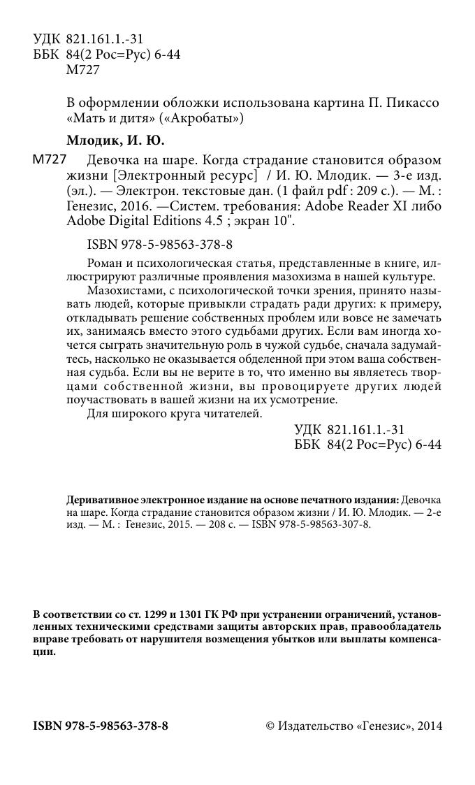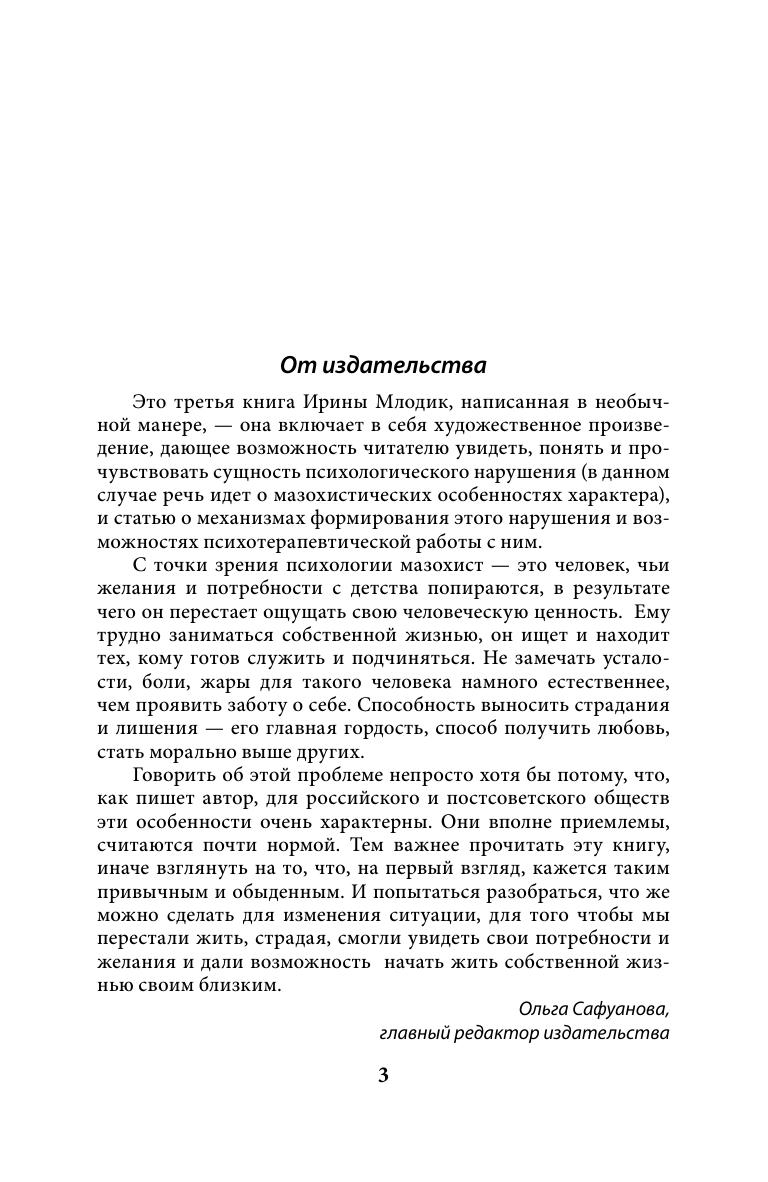 Роман и психологическая статья, представленные в книге, иллюстрируют различные проявления мазохизма в нашей культуре.